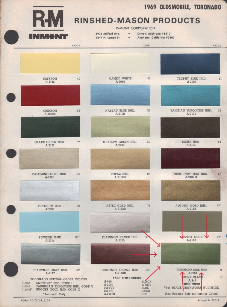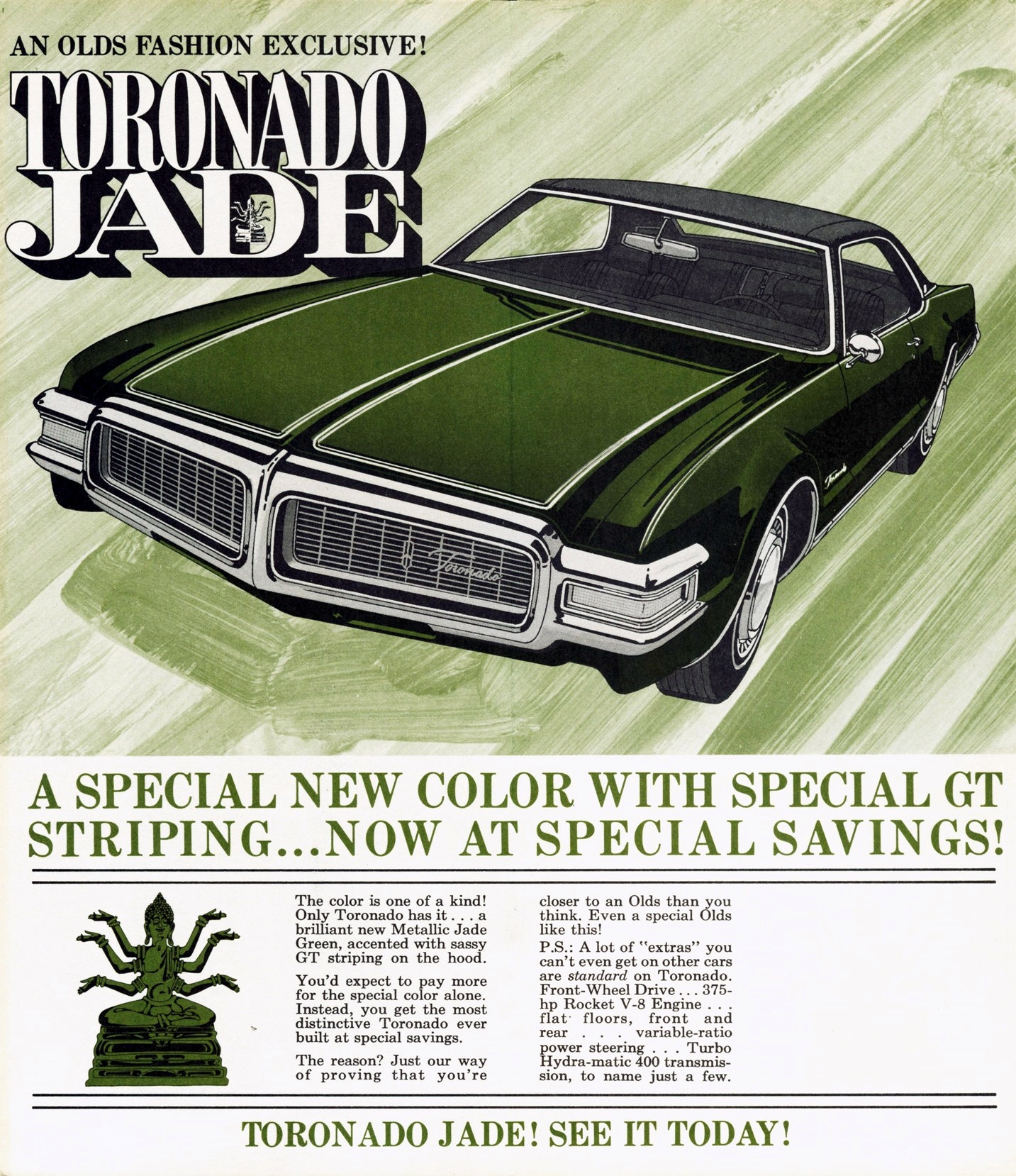 This 1969 Oldsmobile Toronado is a promotional model called Toronado Jade. I’ve dug into newspaper sites and could not find anything on it other than what you can see here, a Toronado painted in Metallic Jade Green (a color not normally available for the Toronado at the time). The late, lamented website Automotive Mileposts said it was a spring promotion introduced in April 1969. “You’d expect to pay more for the special color alone,” says this neat item. “Instead, you get the most distinctive Toronado ever built at special savings.” Another special feature appears to be “GT striping” on the hood, something not normally available on regular Toronados. In fact, it resembles the standard striping for the 4-4-2.