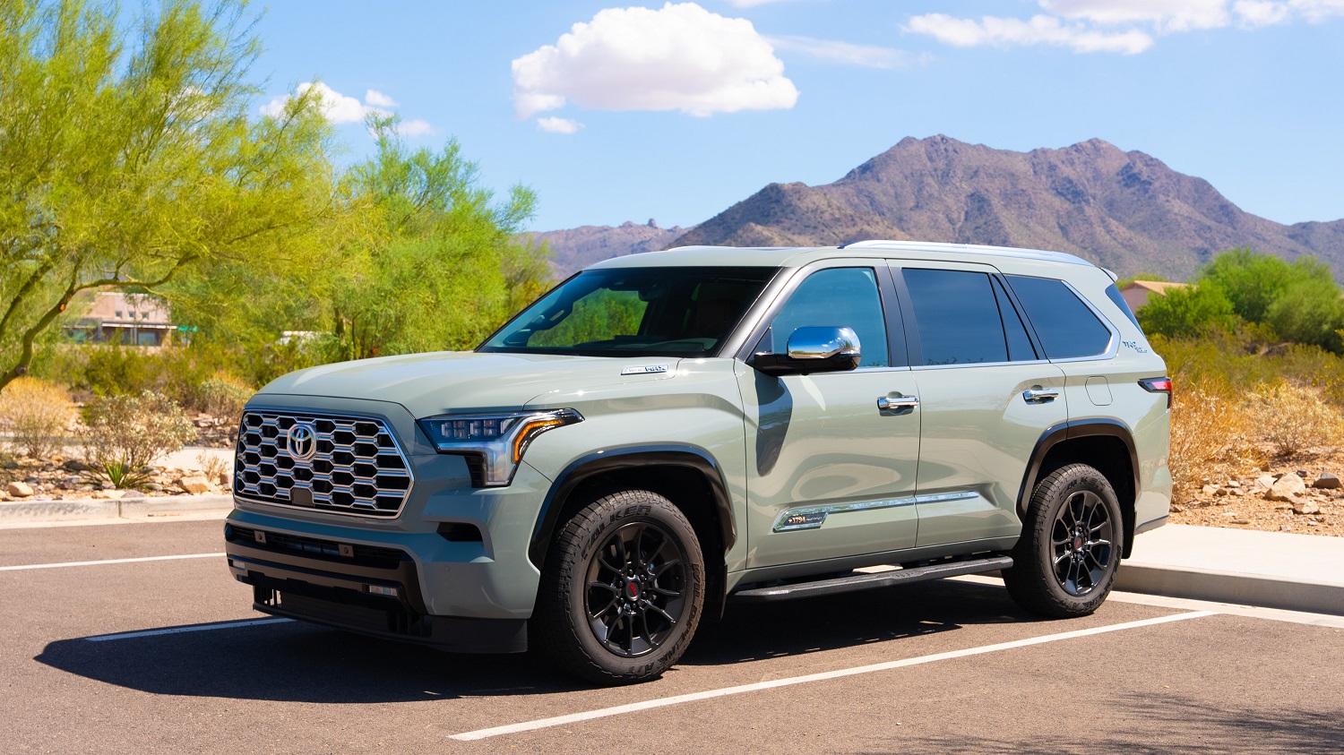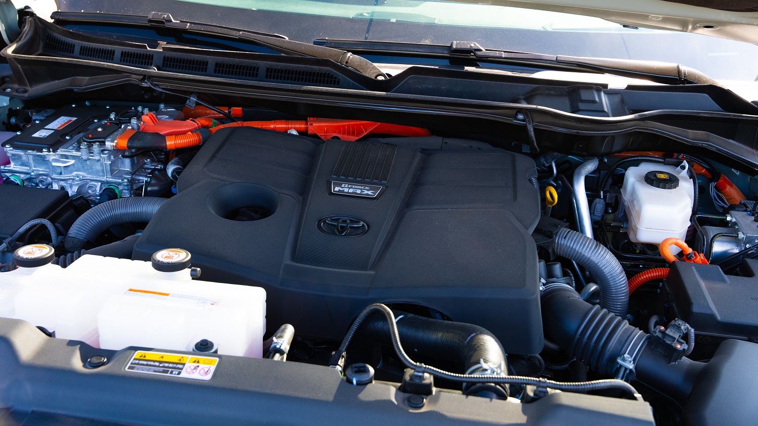 The switch from the previous-generation Sequoia’s 5.7-liter V8 and six-speed automatic to the current model’s twin-turbo 3.4-liter V6, 36-kw electric motor, and 10-speed auto brought a substantial increase in output. Horsepower shot up by 56 to 437; torque rose by 182 lb-ft to 583. Boy, can you feel it! The Sequoia’s size and roughly three-ton curb weight were more than matched by its grunt. Every deep push of the gas pedal showed just how hard the Sequoia pulled.