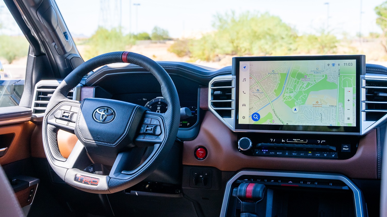 In terms of features, there was plenty to like about the Sequoia’s cabin. It was thoroughly modern, thanks to the 12.3-inch digital gauge cluster, 10-inch head-up display, digital rearview mirror camera, and 14-inch infotainment display. Next to and below the 14-speaker JBL audio system’s chunky volume knob were easily accessible controls for the heated and ventilated front seats (the massage function was in a menu on the touchscreen), tri-zone climate control system, and off-road features.