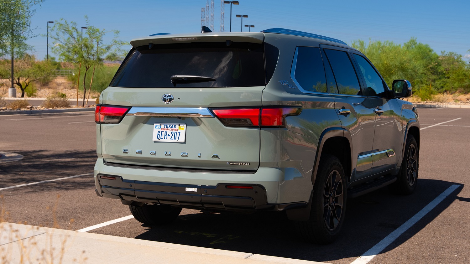 Dimensions were also an issue in the rear cargo area. The Sequoia’s 1.87-kWh nickel-metal hydride battery pack is under the third row, raising the height of the split bench seat; when lowered, the seatbacks prevent the entire load floor from being completely flat. To make the best of that less-than-ideal situation, Toyota equips the Sequoia with a removable shelf that can be set at multiple levels, including one which helps the shelf extend the flat surface formed when the third row is folded down. The problem is that whatever you put on that platform is still elevated—and that much closer to the side windows and the heads of the people riding in the second row, which made for a worrisome drive home from Costco with two cartfuls of large, heavy items.
