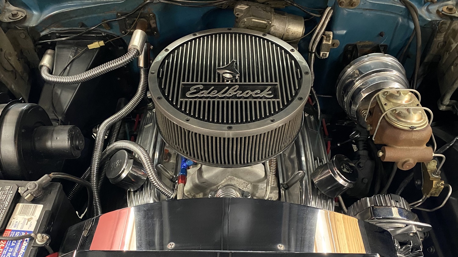 The 351ci V8 is topped by an Edelbrock Torker aluminum intake manifold and a 3310 Holley double-pumper carburetor, and Cleveland-script valve covers were added along with an aluminum radiator, AN fuel lines, and Accel ignition. The battery has a shutoff.