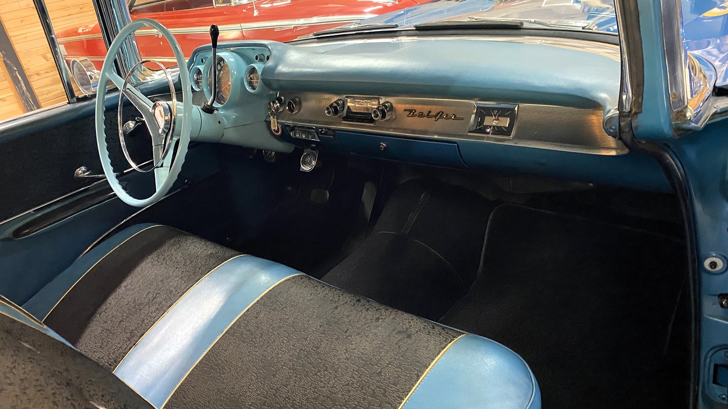 The dashboard was customized with additional Stewart-Warner gauges, and the glove box door was cut in half and split either side of the gauges.