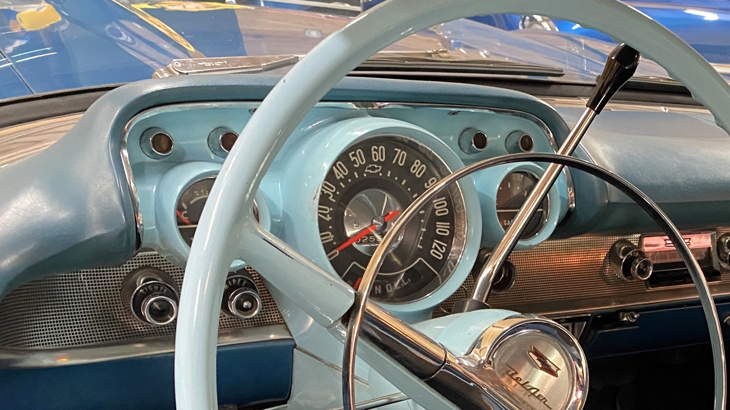 The cabin offers two rows of blue vinyl and black cloth seating. Surrounding features include power steering, column-mounted automatic shifter, AM radio, clock, and rear window louvers.