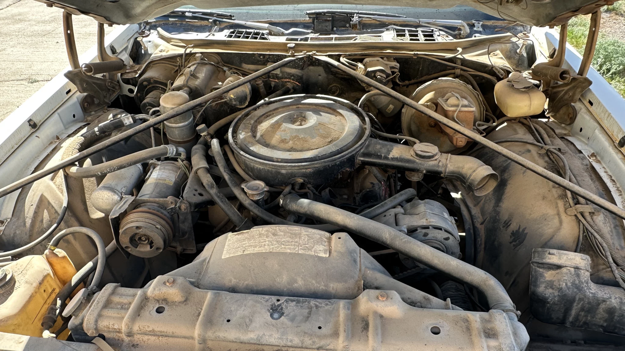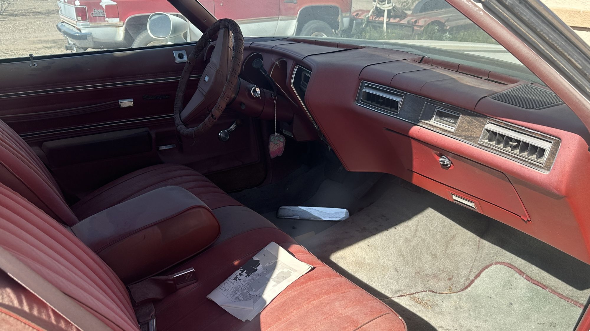 Even in its abandoned-looking state, the car had a sense of status. The radio had been removed, but the woodgrain trim bezel remained. The red interior had largely faded to pink, and the carpet was closer to white. The dash showed massive cracks consistent with long-term Arizona exposure, and the rearview mirror sat in the passenger footwell for some reason. Miraculously, the headliner was still intact and in nice condition.