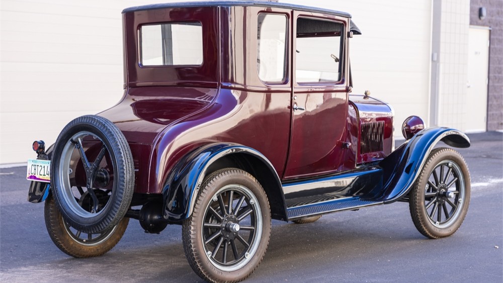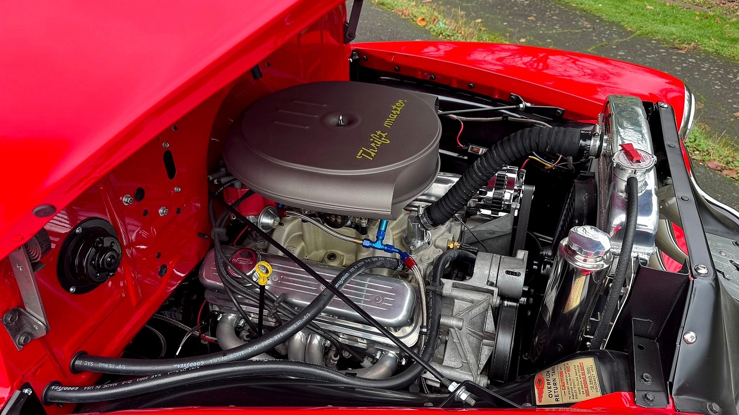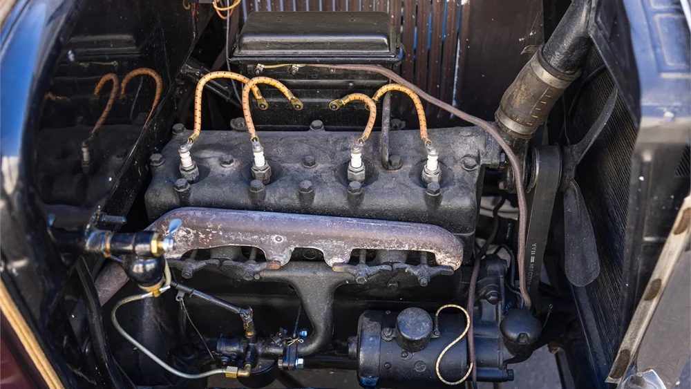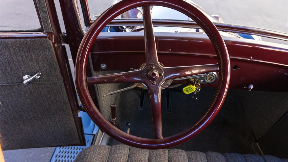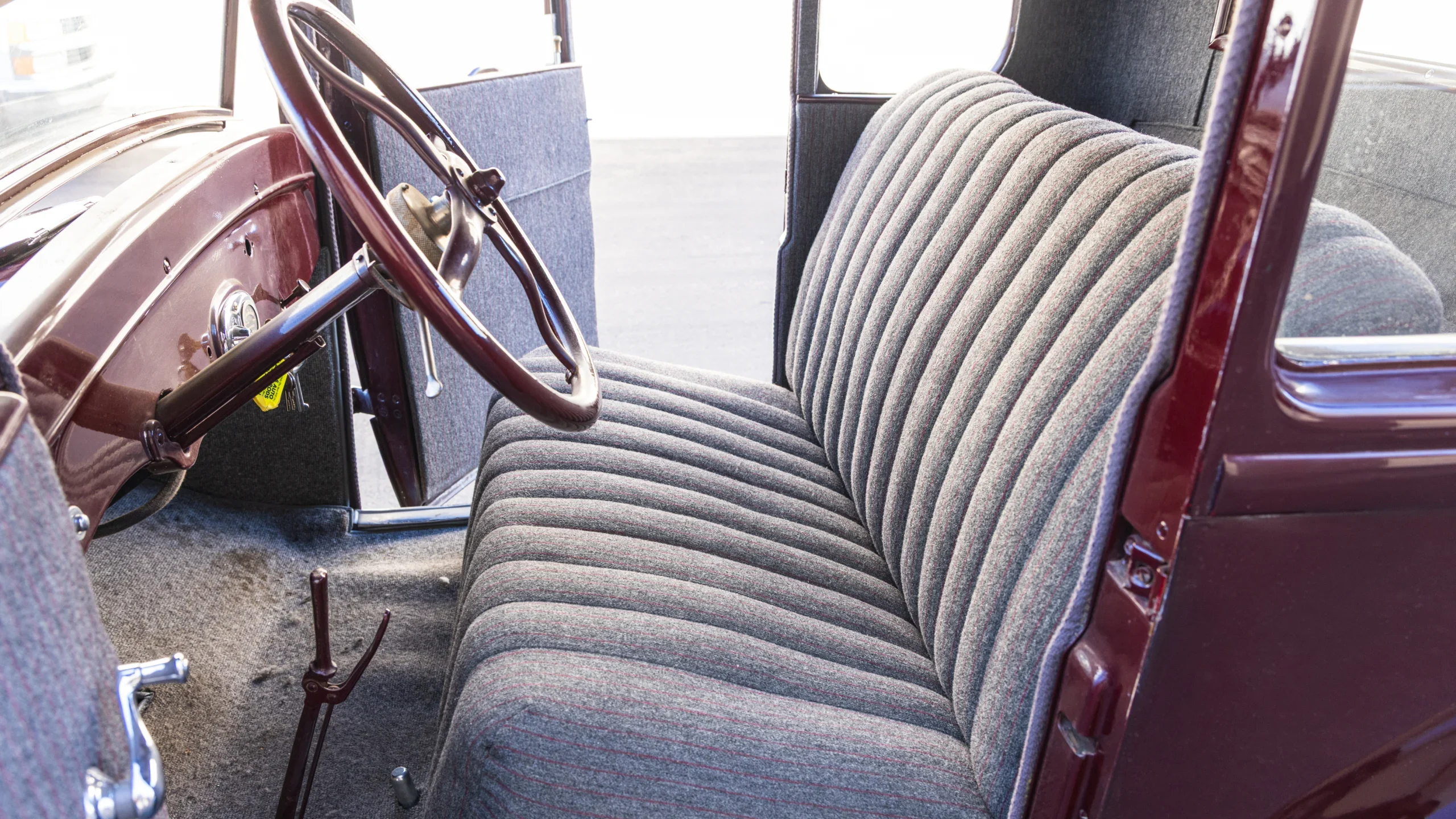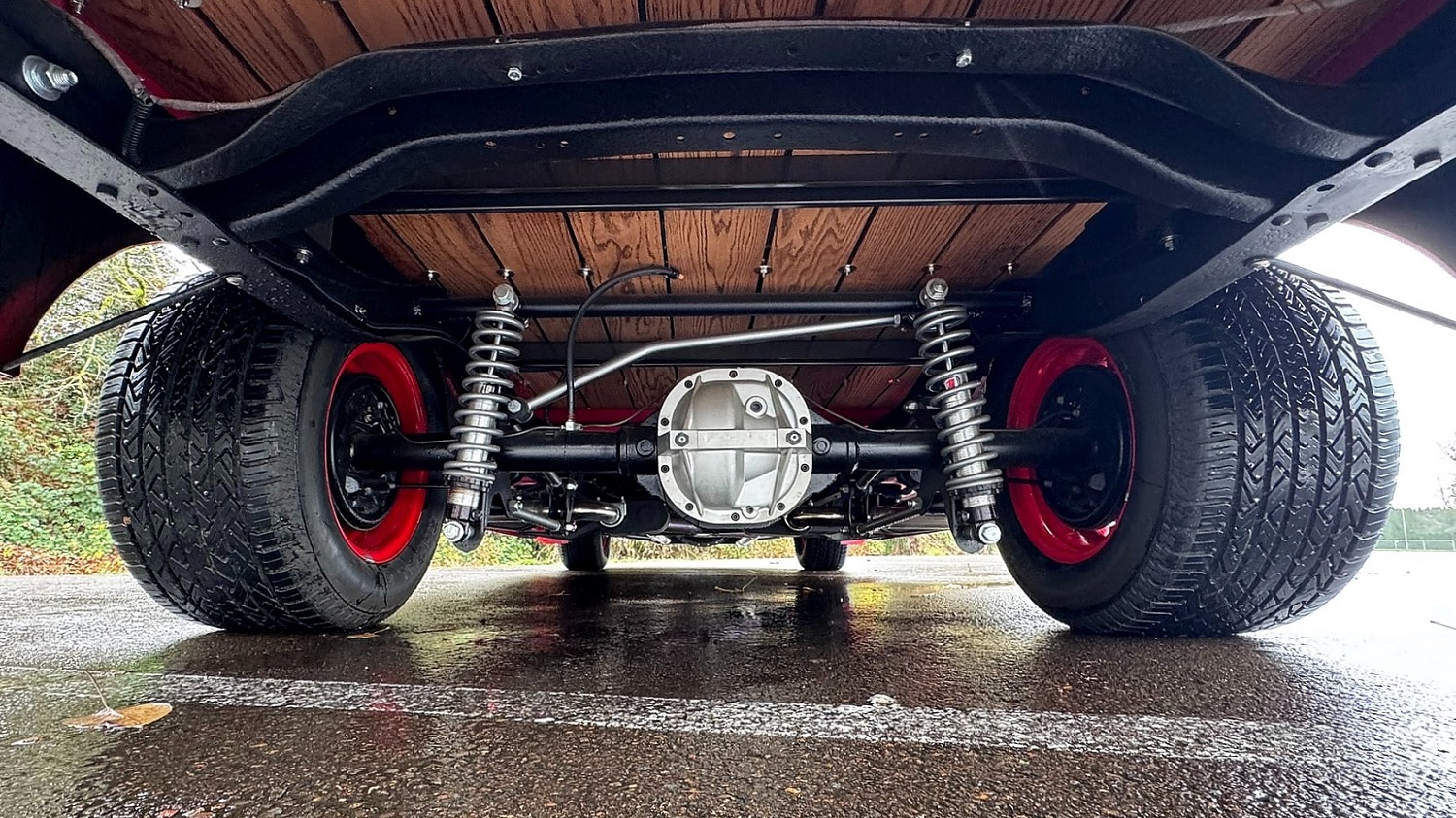 Maroon-finished 18” wire wheels wear polished hubcaps and are wrapped in 7.00” Coker Excelsior tires. The drop front axle is supported by ladder bars and adjustable coilovers, while the rear axle is rigidly mounted to the frame. Braking is handled by hydraulic rear drums.