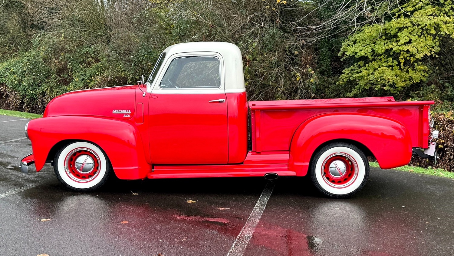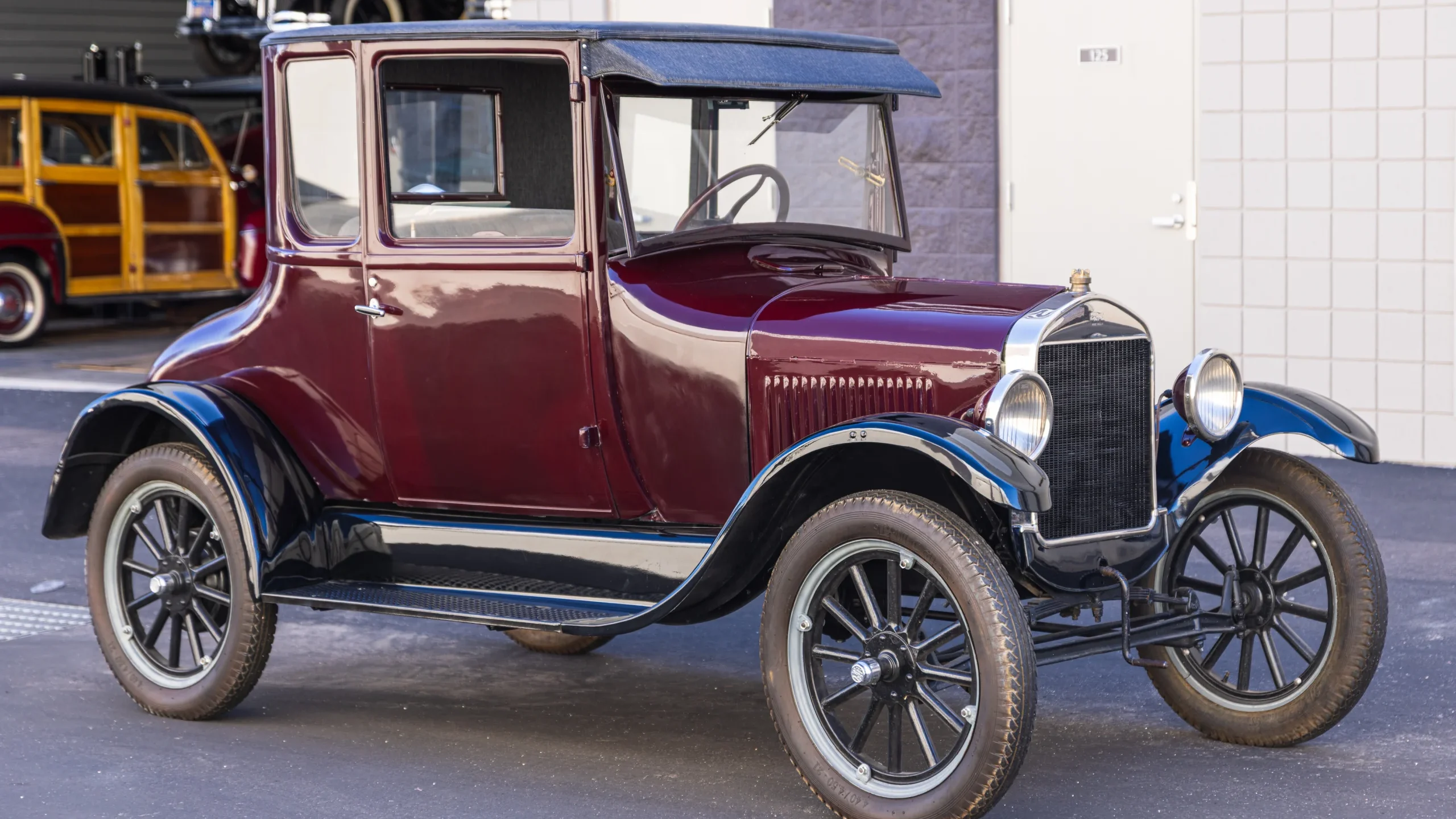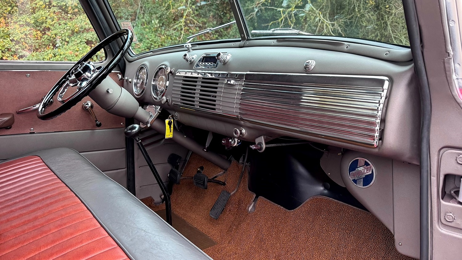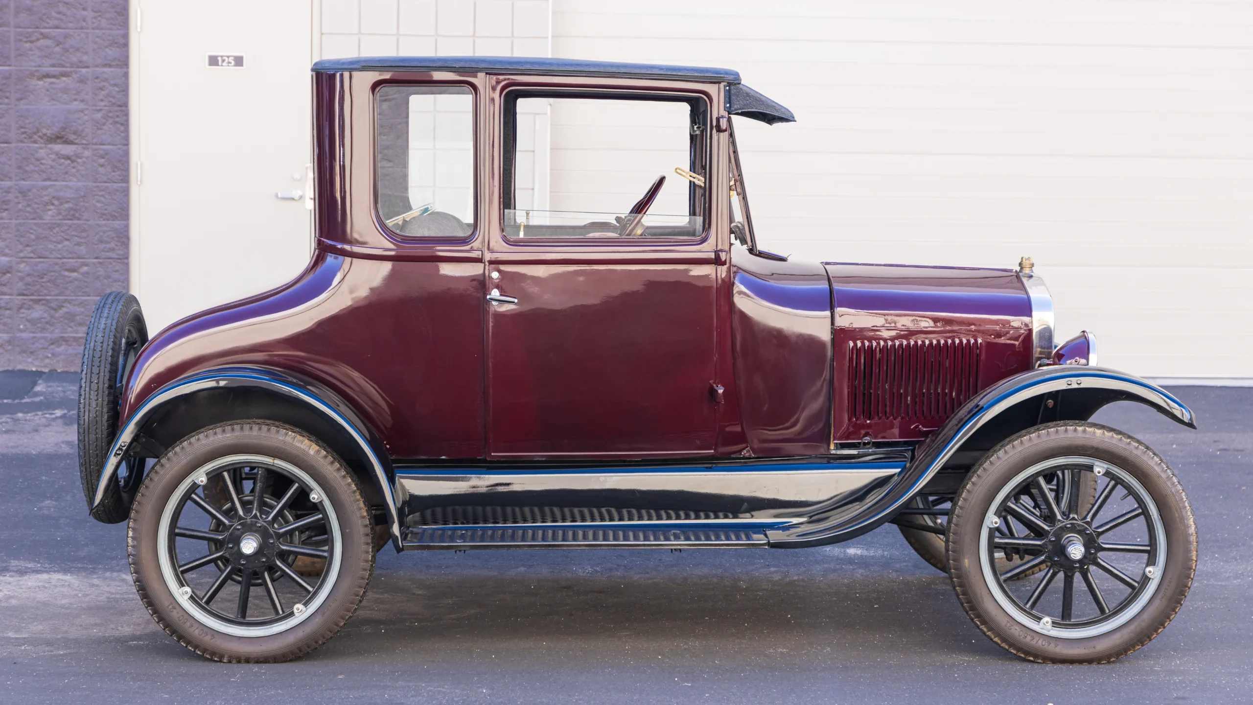Maroon-finished 18” wire wheels wear polished hubcaps and are wrapped in 7.00” Coker Excelsior tires. The drop front axle is supported by ladder bars and adjustable coilovers, while the rear axle is rigidly mounted to the frame. Braking is handled by hydraulic rear drums.
