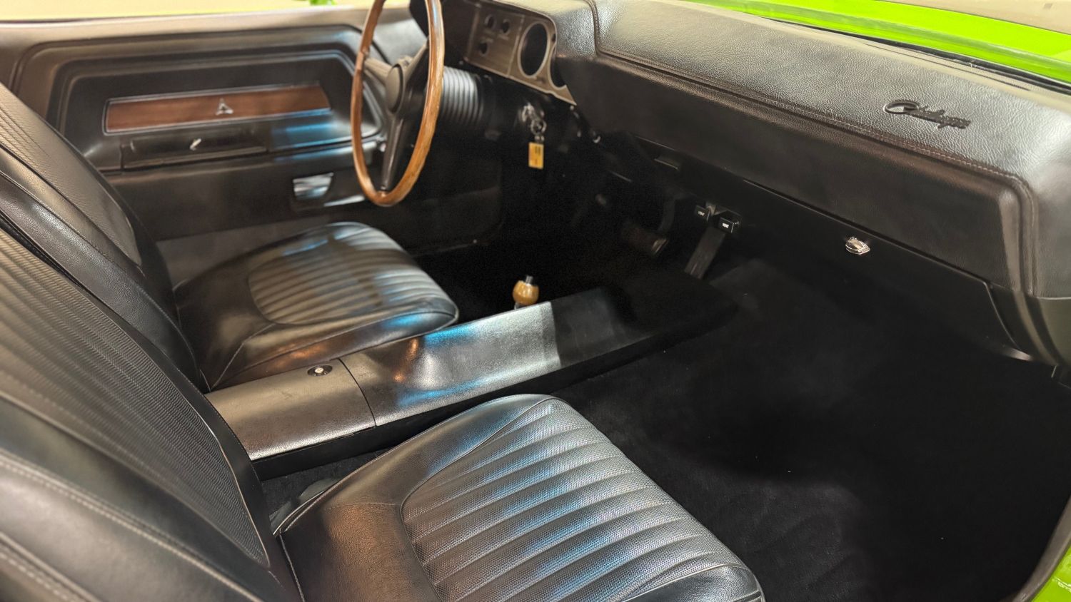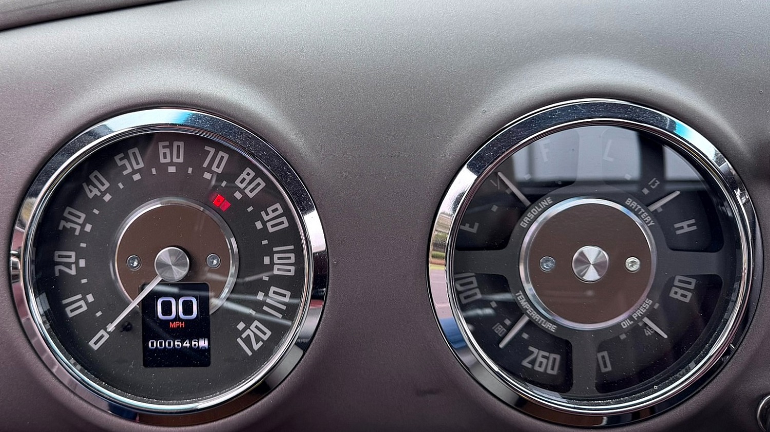 The steering yoke has wood grips and sits ahead an engine-turned bezel housing a variety of aircraft gauges including a functional tachometer. The car is not equipped with an odometer.