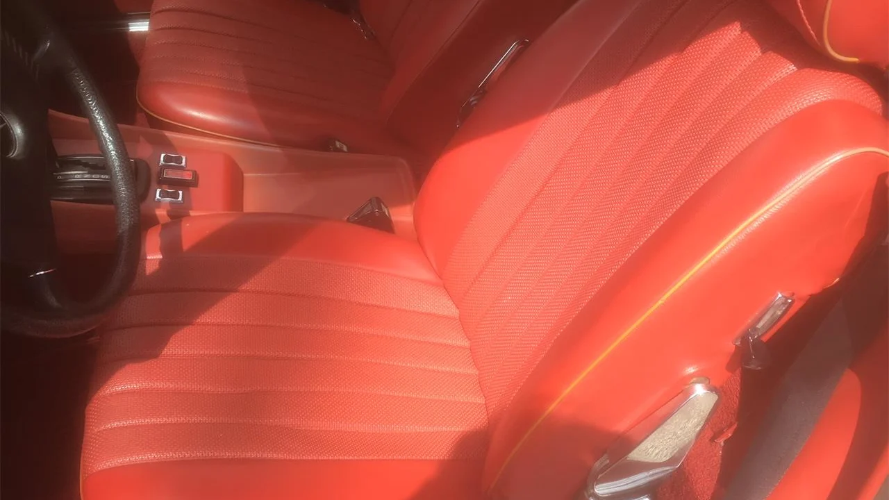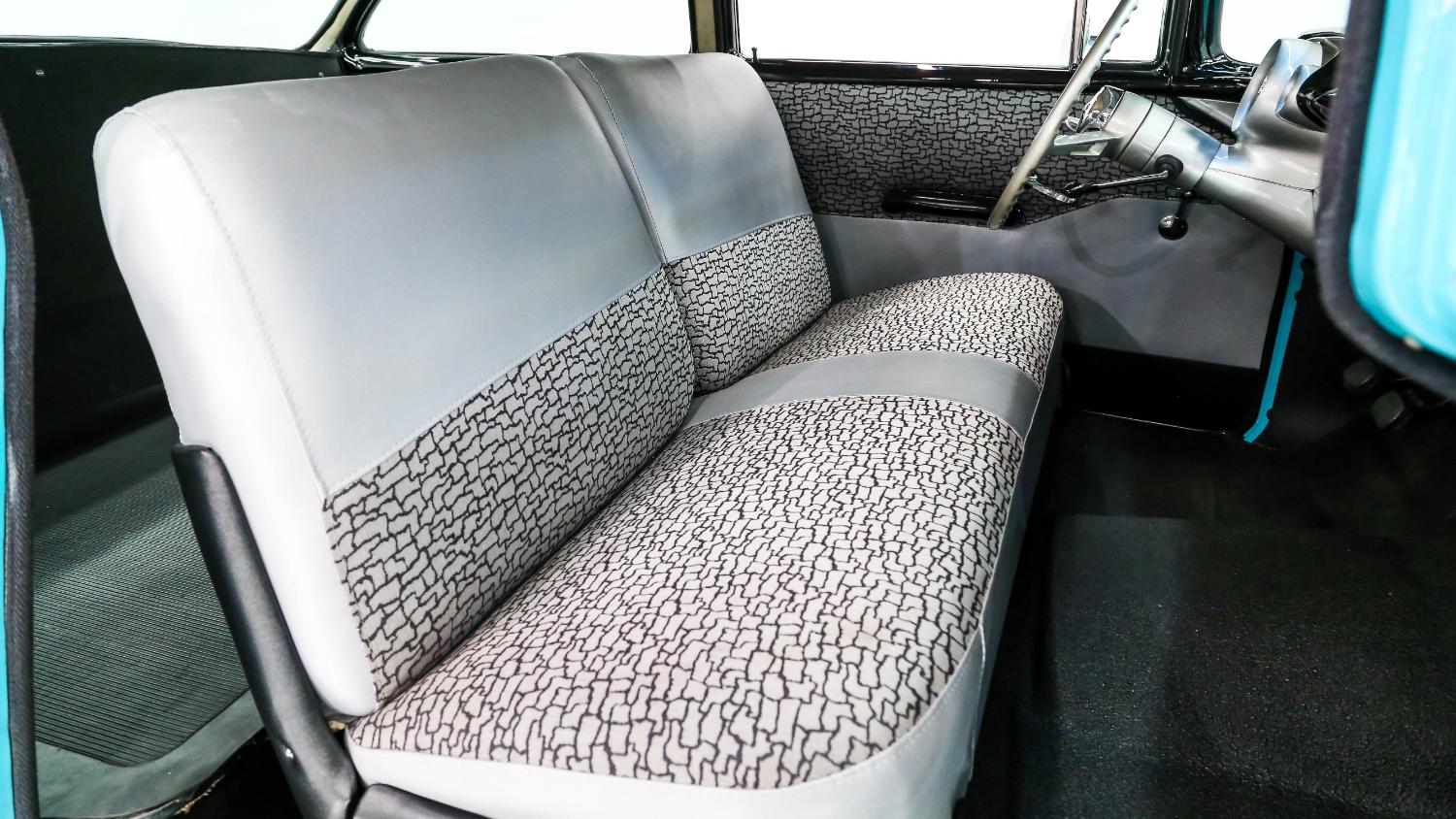 There are different shades of blue in the cabin, including blue vinyl and cloth on the bench seat. The dashboard is a combination of another blue on top and Mariner Blue on the bottom. Comfort and convenience features include tilt steering column, power steering, and Pioneer AM/FM/cassette stereo.