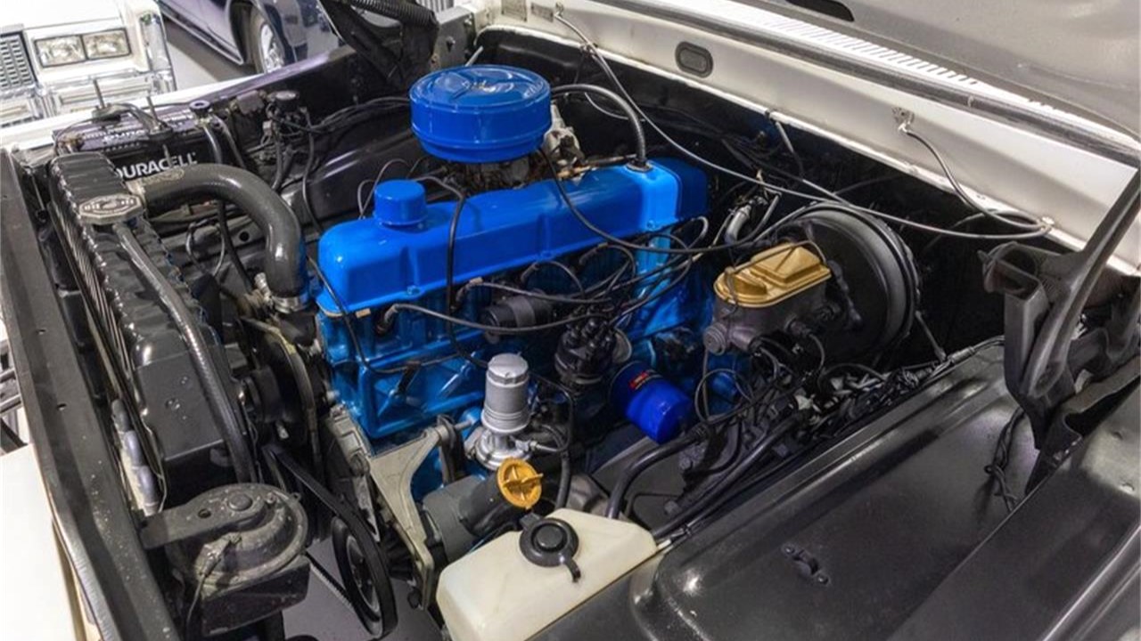 The seller states that the vehicle may have been fitted with a different engine in the past, and the current overbored 226ci inline-six is sourced from a ’46 Ford. It features domed aluminum pistons, an external oil filter housing, and a Cyclone finned aluminum cylinder head. Triple Ford 94 carburetors are mounted to a Tattersfield intake manifold and connected to a progressive linkage, with the central unit acting as the primary. Fuel is drawn from dual tanks connected in series, and cooling is provided by radiators mounted ahead of and alongside the engine. Coolant and oil leaks are noted along with corrosion on various components.