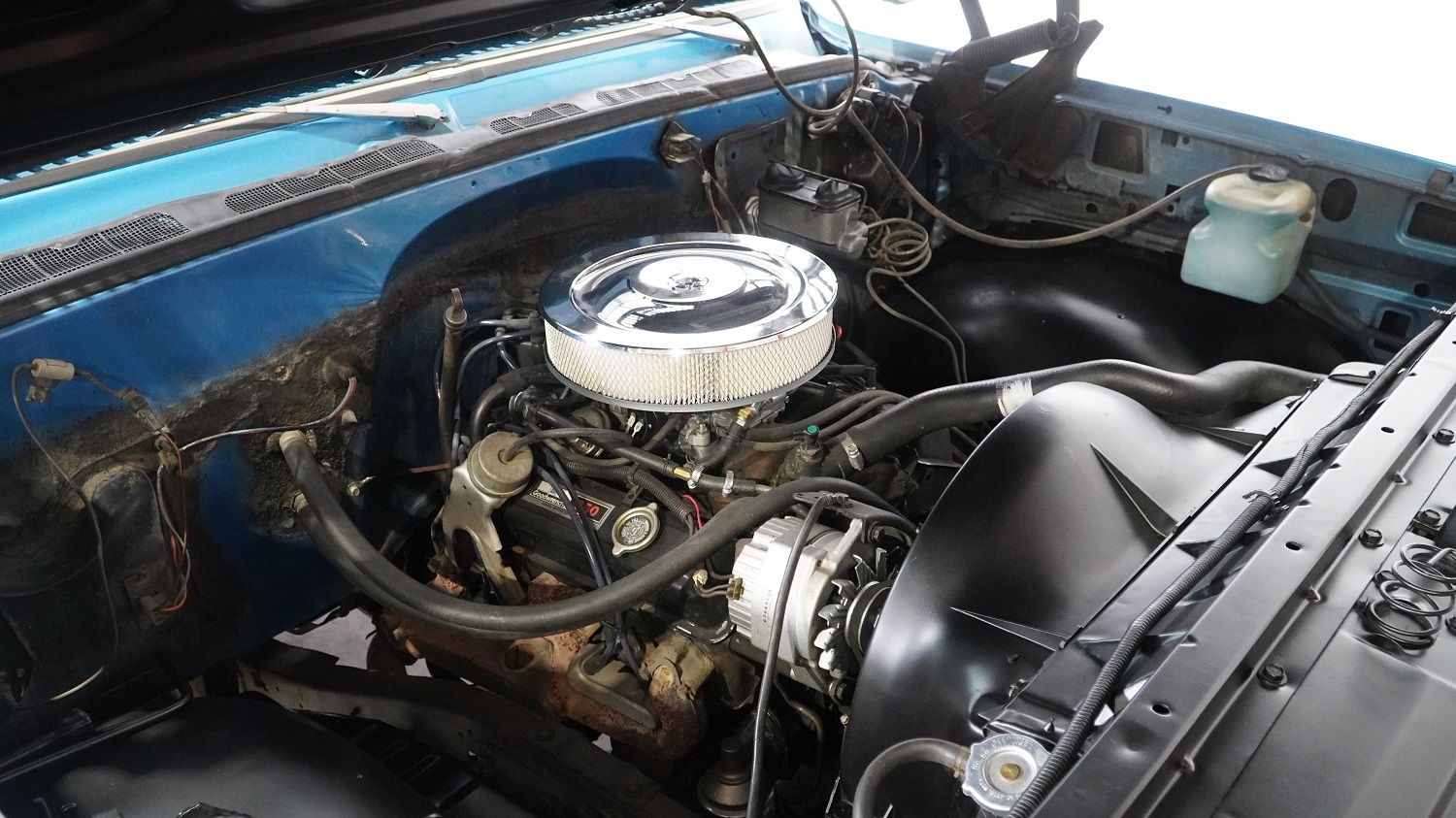 The “Square Body” has been refinished in its original color of Mariner Blue. Exterior features include chrome bumpers, replacement windshield, dual mirrors, Soft-Ray tinted windows, sliding rear window, tailgate protector, and single exhaust outlet.