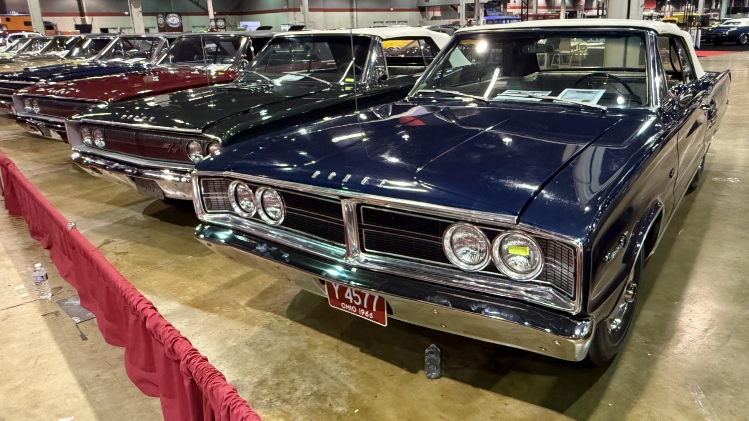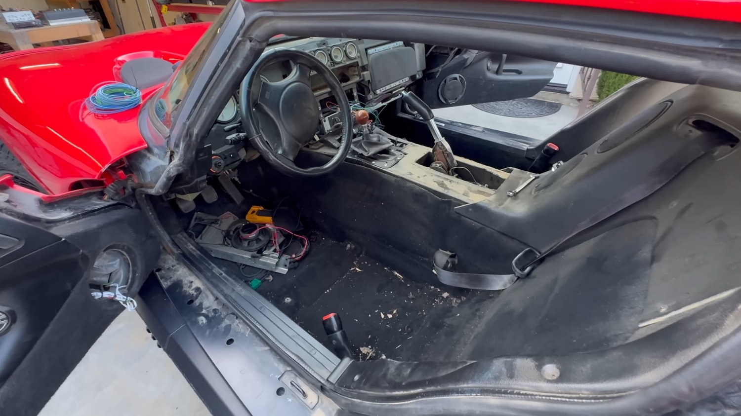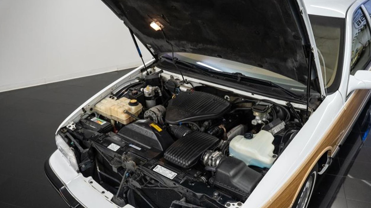 The 331ci Cadillac V8 was reportedly built by Anolik and the San Francisco Shifters car club in 1958 and features Offenhauser finned valve covers, ported 1956 Cadillac cylinder heads, ForgedTrue pistons, boxed connecting rods, a Herbert roller camshaft, a Joe Hunt Vertex magneto, custom pulleys, and a Cragar blower manifold. Induction is handled by a quartet of Stromberg carburetors with chrome stacks atop a GMC 4-71 blower that was reportedly sourced from a Greyhound bus mechanic in the 1950s. An electric cooling fan was installed during the refurbishment, and it is controlled via a switch on the dashboard.