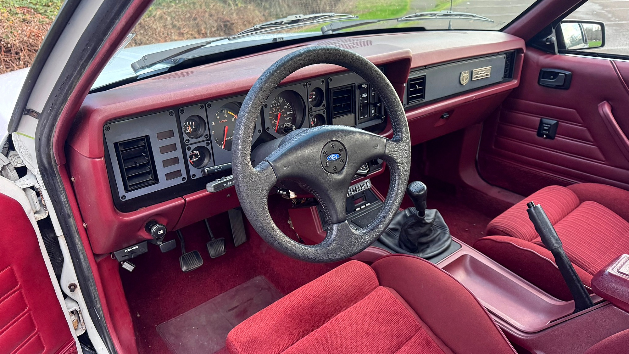 The four-way power-adjustable front bench seat was retrimmed in black upholstery with white pleated inserts and blue and red accents during the refurbishment. Matching upholstery extends to the door panels, and a black dashpad is fitted along with color-coordinated carpets. The dashboard retains a Ford push-button AM radio, a clock, a locking glovebox, engine-turned trim, and a Thunderbird badge. A C1 Corvette-sourced floor shifter was installed in the 1950s.