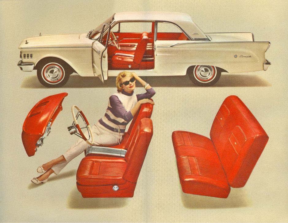 Comet The Comet S-22 was the first of the bunch to cash in on the popularity of sporty compacts, initially appearing mid-year in 1961. A brochure dedicated to this upscale two-door sedan claimed it had the “newest, niftiest interior under the smartest roof in the compact field!” Foam-contoured bucket seats up front, vinyl-clad steel console with hinged-door glove box in between the front buckets. Tasteful ornamentation. Extra insulation. Plus, cigarette lighter, front-door courtesy light switches, and bright metal door and window frames.