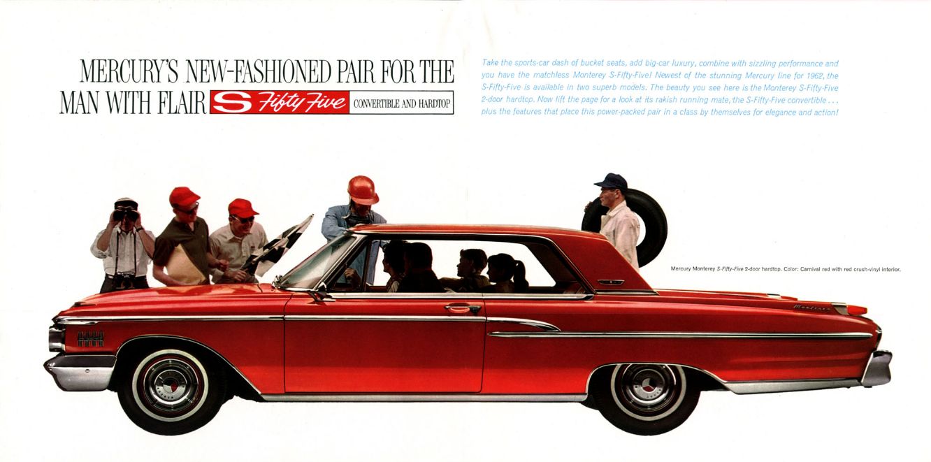 Monterey Nineteen sixty-two was the year that many full-size cars jumped on the sporty bandwagon, and Mercury was no different. Available as a hardtop or convertible, the mid-year 1962 Monterey S-55 “joins the bucket-seat sizzlers” with contoured bucket seats and console, three-spoke steering wheel, “deep, rich carpeting,” distinctive door panels with armrests and carpeting and courtesy lamps, padded instrument panel, electric clock, back-up lights, and pedals “edged and ribbed with bright metal.” Standard was a 292 small-block V-8, with 352 and 390 big-blocks as options. Eventually, a four-speed and two versions of the new 406 V-8 became available.