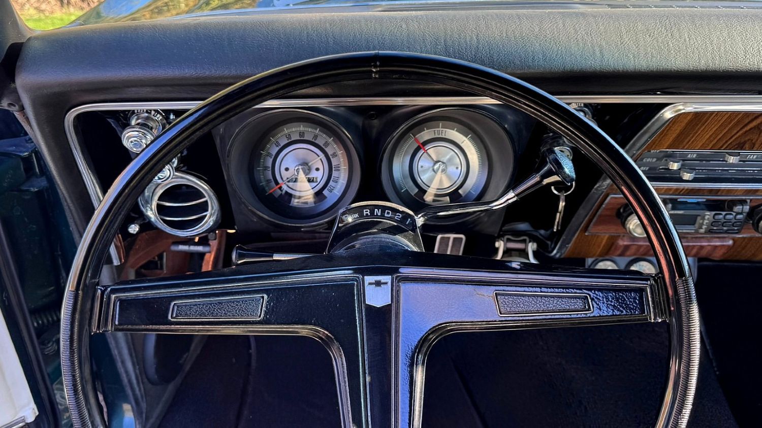 The ivory-colored steering wheel, wood-tone dash, and engine-turned dash trim add contrast and texture. What’s harder to see is that the wheel is connected to power steering, and the column-mounted shifter behind it controls a three-speed manual transmission.