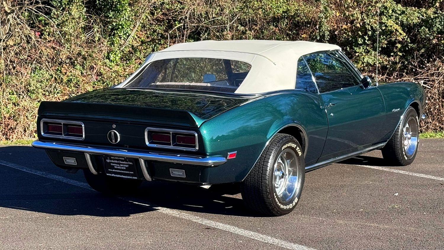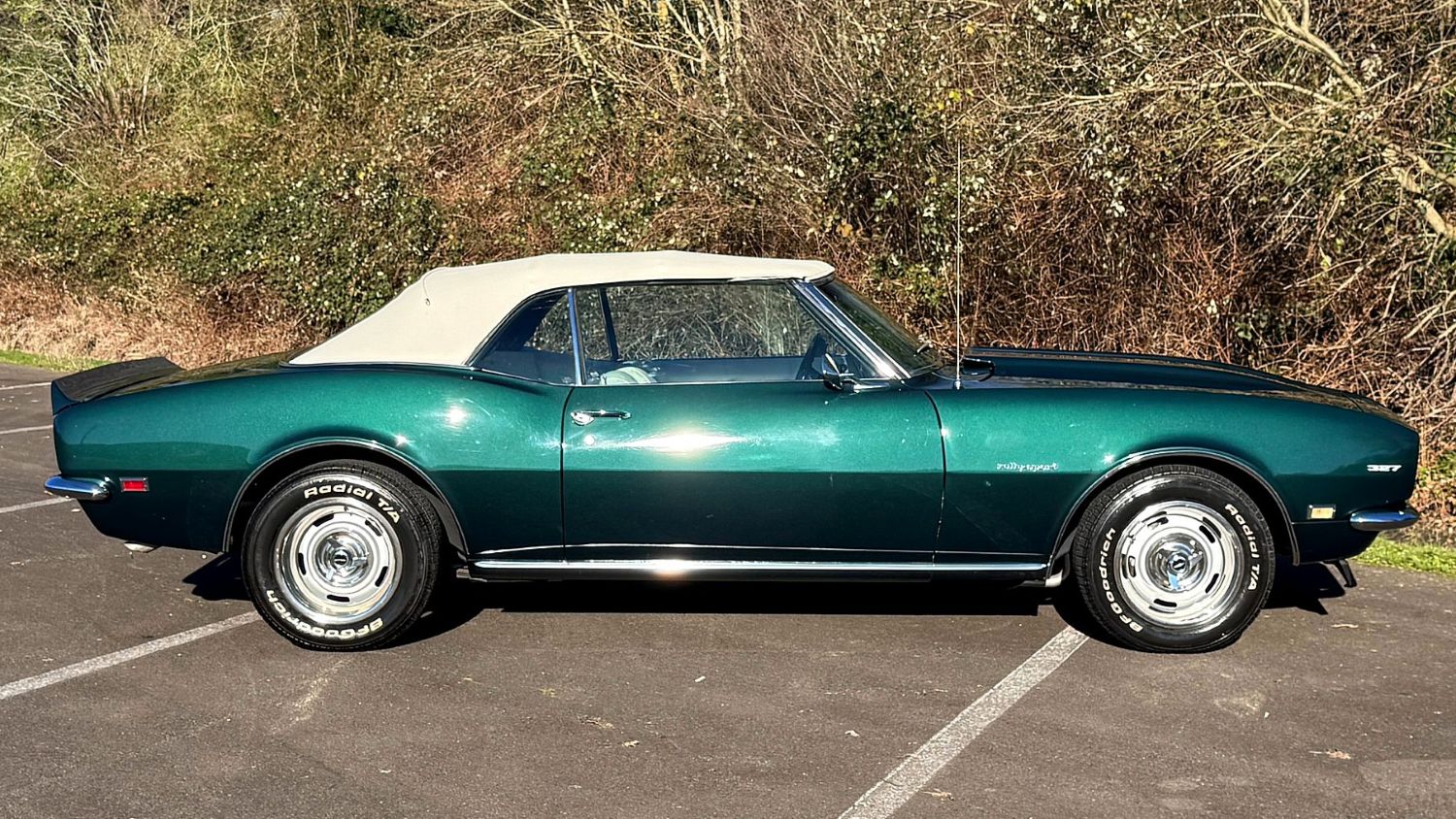 British Green was a mid-year introduction for the 1968 Camaro, one of three colors borrowed from the Corvette as part of a marketing push. It is complemented by a white convertible top. Other features include front and rear spoilers, hidden headlights (as part of the RS package), aftermarket Cowl Induction hood, chrome side mirrors, and black lower rockers. A set of 15-inch Rally wheels are fitted with staggered width radials — 215/60 up front, 265/50 out back.