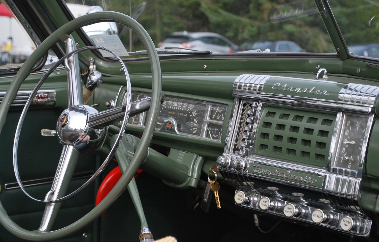 The Henry Ford steel body was channeled 7″ up front, 4″ at the rear, and finished in the 2003 Nissan hue of Canteen Green metallic (D13) with a PPG satin clear coat and pinstriping by Kent Brotherton. Exterior features include Ford truck Guide-style LED headlights, rear-hinged doors, a tilt-out windshield, a padded black vinyl roof, and 1948 Oldsmobile taillights.