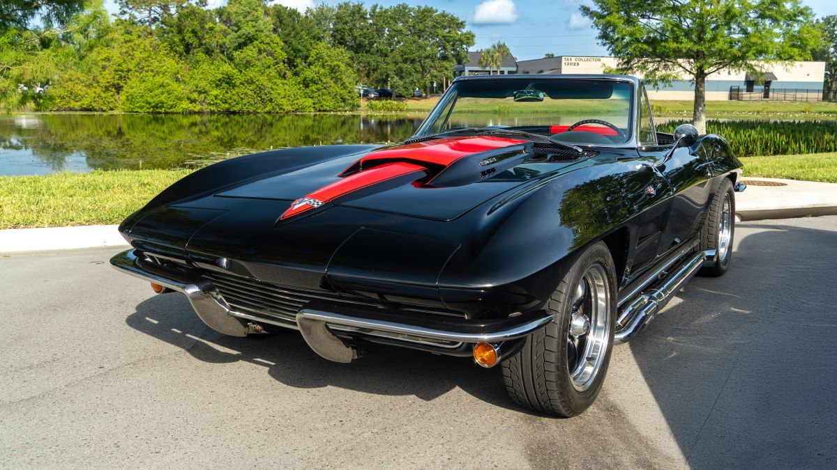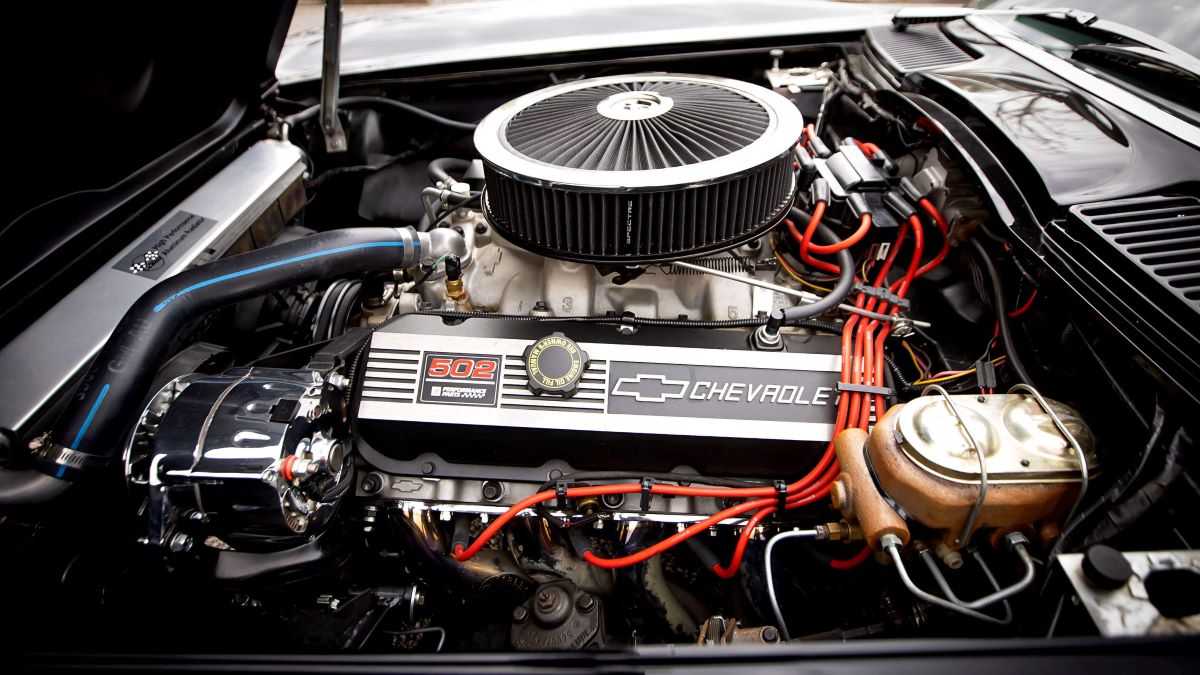 The 350ci V8 was was bored .030″ over and rebuilt utilizing a Howards Cams roller camshaft and Dart heads. It wears Eelco ribbed valve covers along with a matching oval air cleaner cover, and a 650-cfm Holley four-barrel carburetor is mounted on an Offenhauser intake manifold. 1962 Corvette exhaust manifolds flow into a dual exhaust system equipped with Cherry Bomb mufflers. The radiator is finished in black with a SPAL electric fan and a black billet overfill tank, and a Powermaster PowerGEN alternator, a Delco Remy distributor, and Edelbrock Max-Fire ignition wires were used.