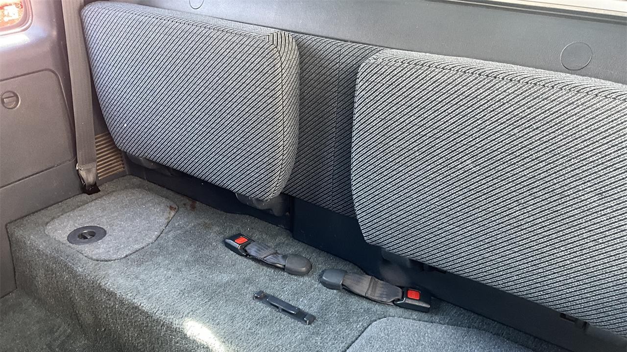The interior upholstered in blue cloth, with a 55/45 split seat up front and dual fold-down jump seats in the rear. Features include air conditioning, radio, and power steering.