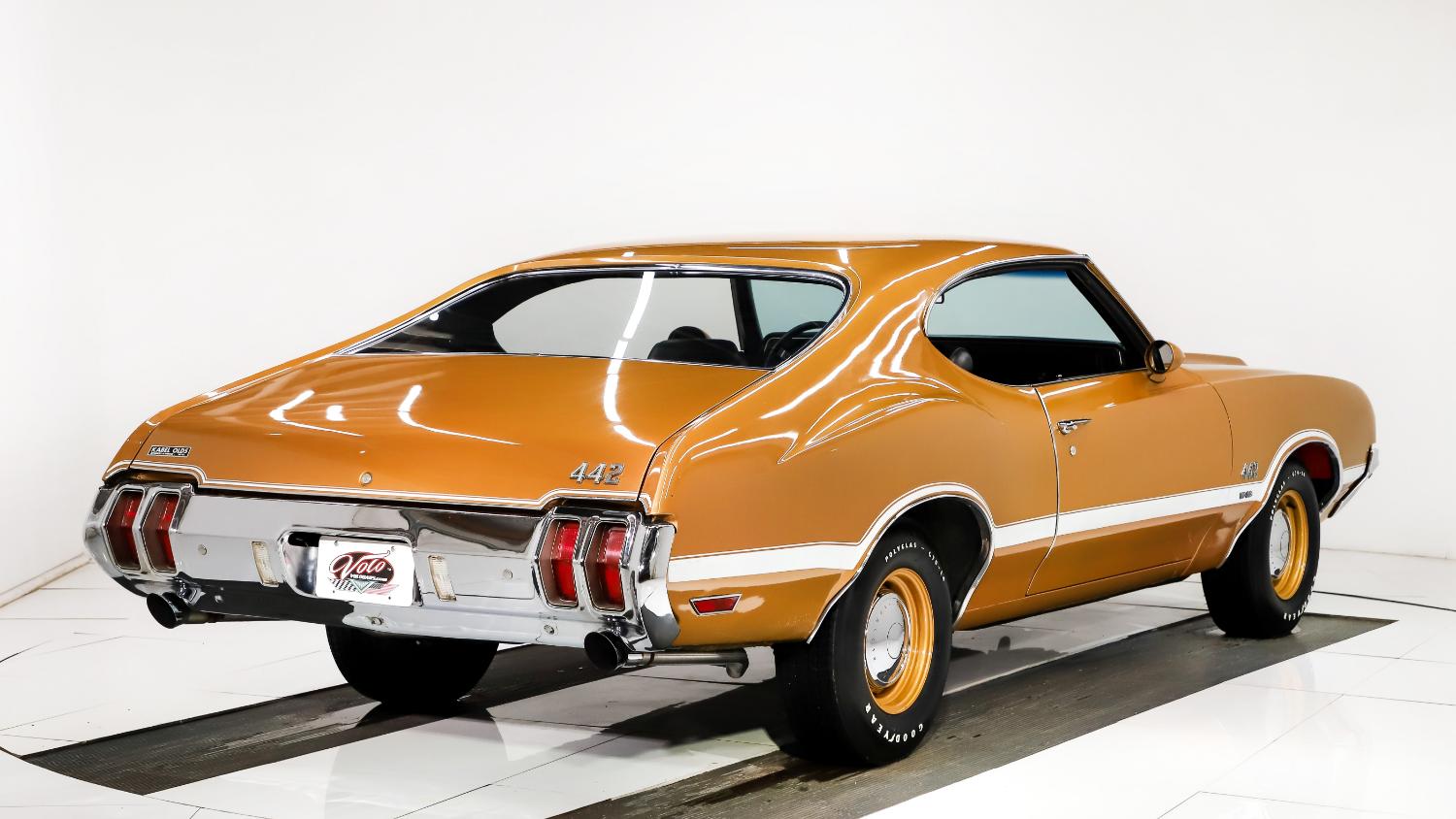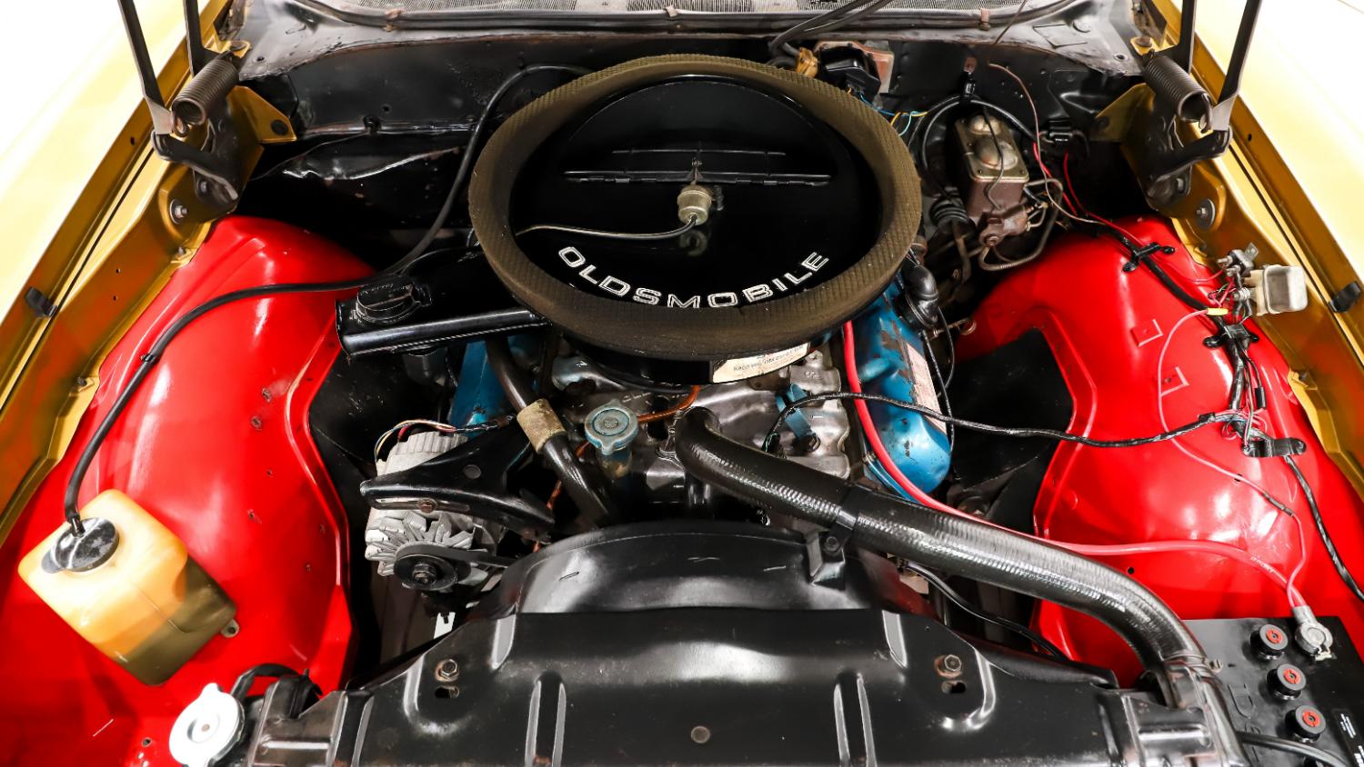 Oldsmobile had four special colors that cost extra, including Nugget Gold. It is complemented by white stripes, which means the original owner specified them since black was the default with this gold. Other exterior features include painted racing mirrors left and right, fiberglass ram air hood with stripes, notched rear bumper, and die-cast badges on all sides. A set of 14-inch wheels with standard hub caps is wrapped in G70 Goodyear Polyglas white-letter tires.