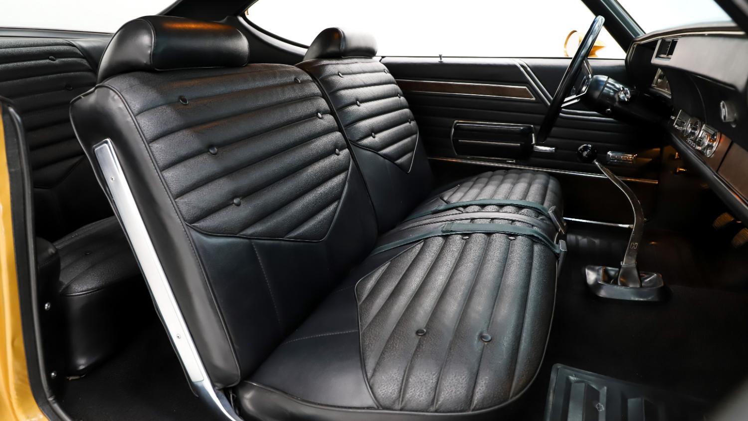 The black vinyl interior features a front split bench seat with a Hurst-shifted four-speed on the transmission hump. Other interior features include a Deluxe push-button AM radio with a rear speaker, simulated woodgrain trim, power windows, and remote driver-side mirror.