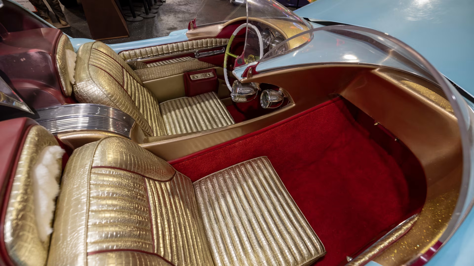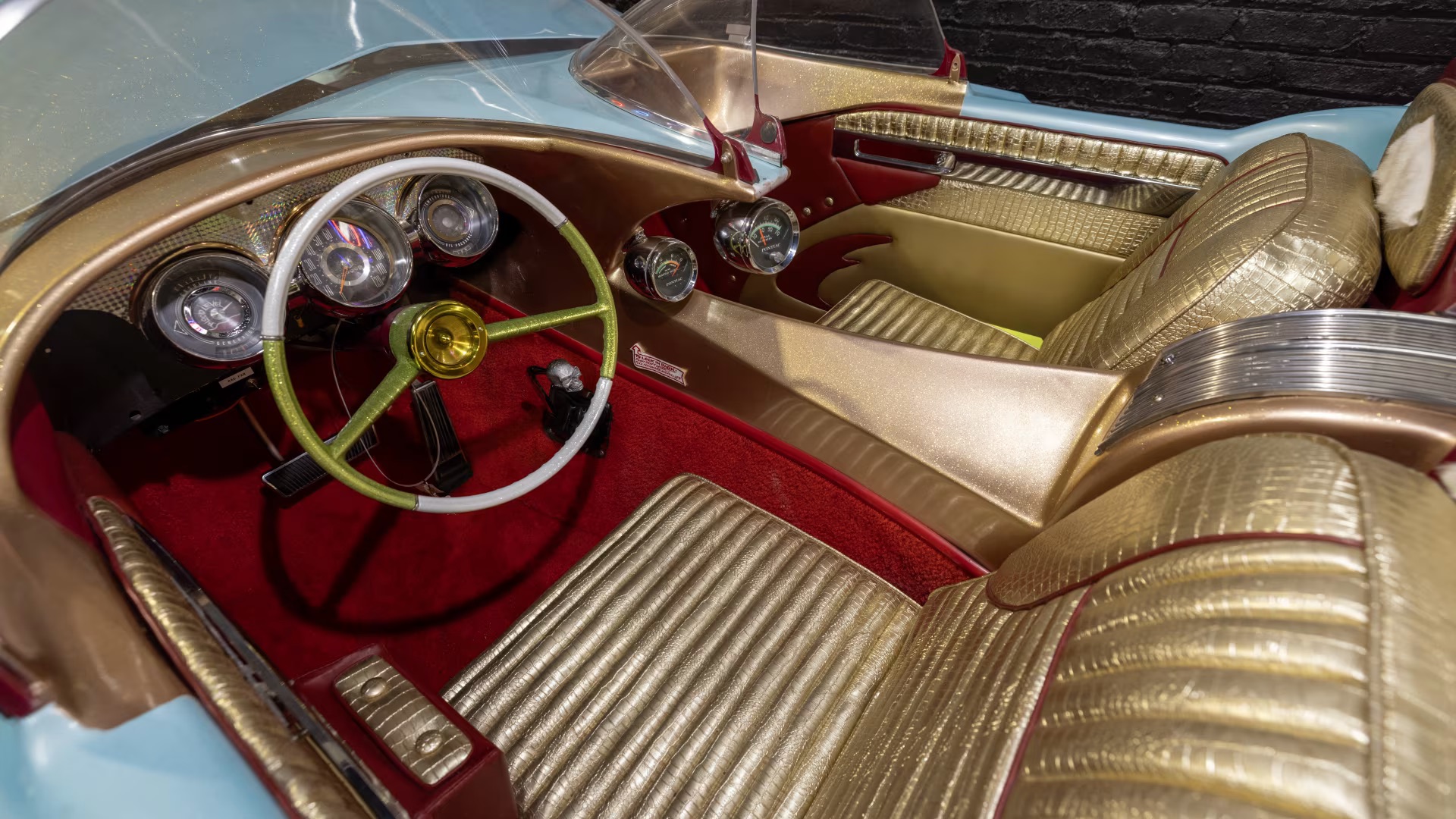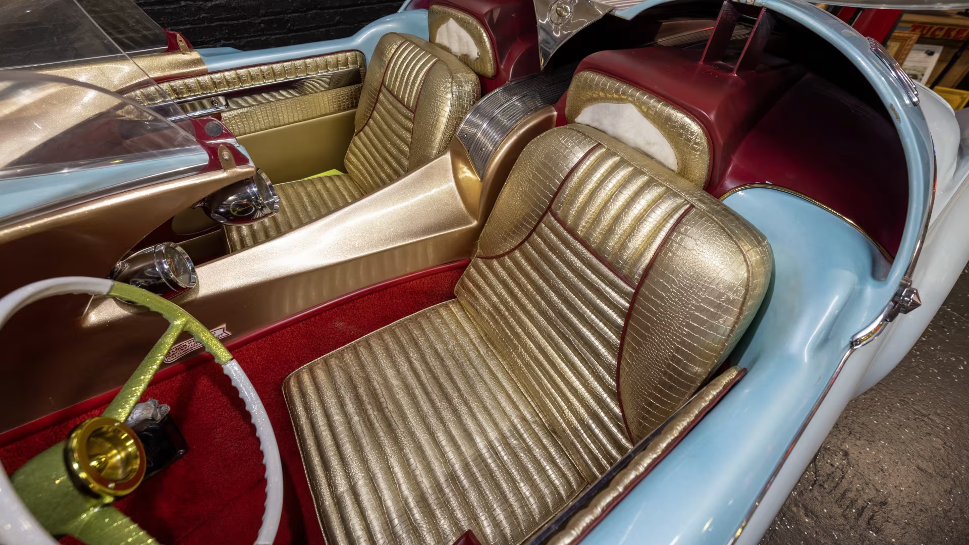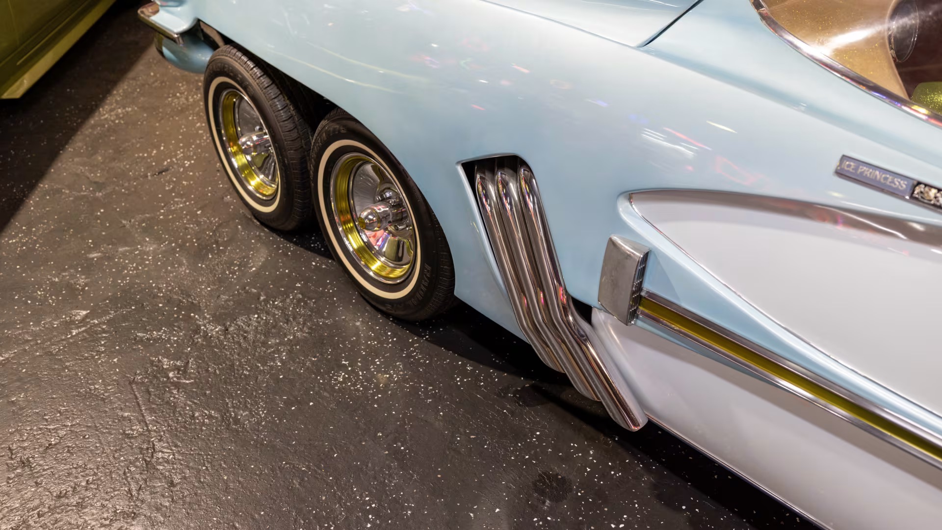 Fletcher’s creation is defined by a series of unconventional design choices. The most notable is the six-wheeled layout, with four wheels in the front for a distinct profile. Other striking details include tapered headlights, Imperial fins, and “nozzle reactors” on the back designed in the style of an early 1960s Cadillac. Powering this elaborate custom is a robust 500ci Cadillac engine, which was sourced from a later model. The interior is equally captivating, with a “Jet Age” theme and golden hues throughout.