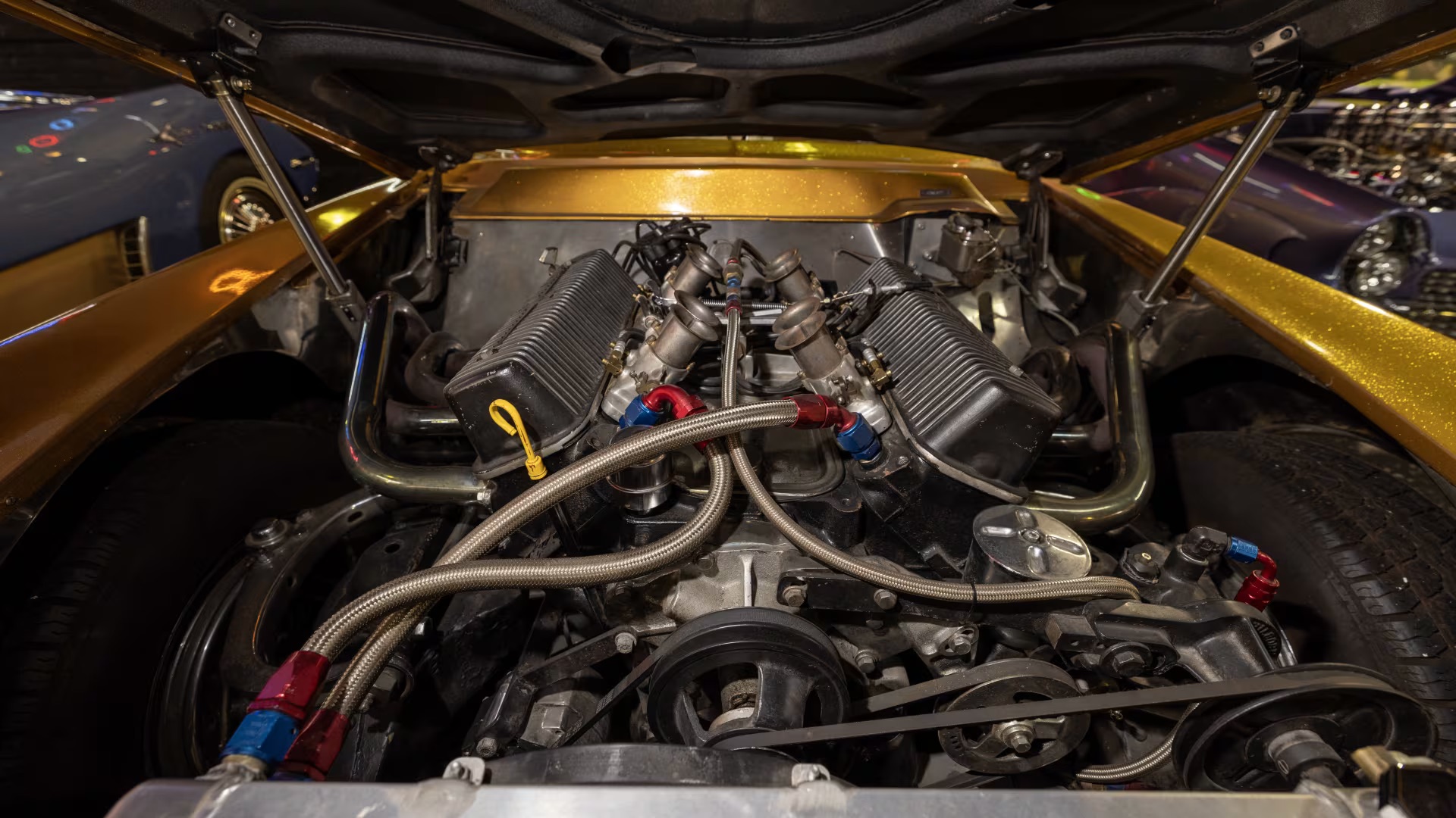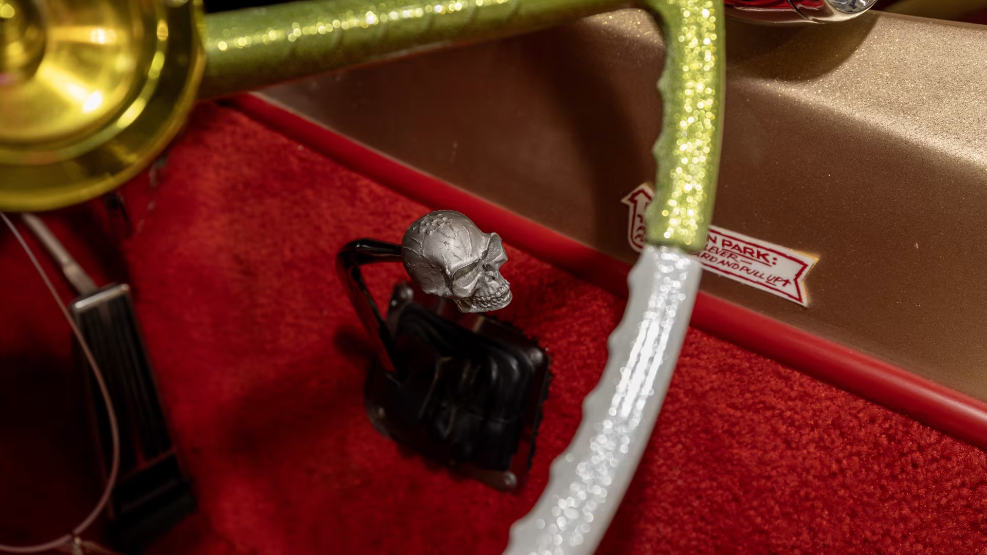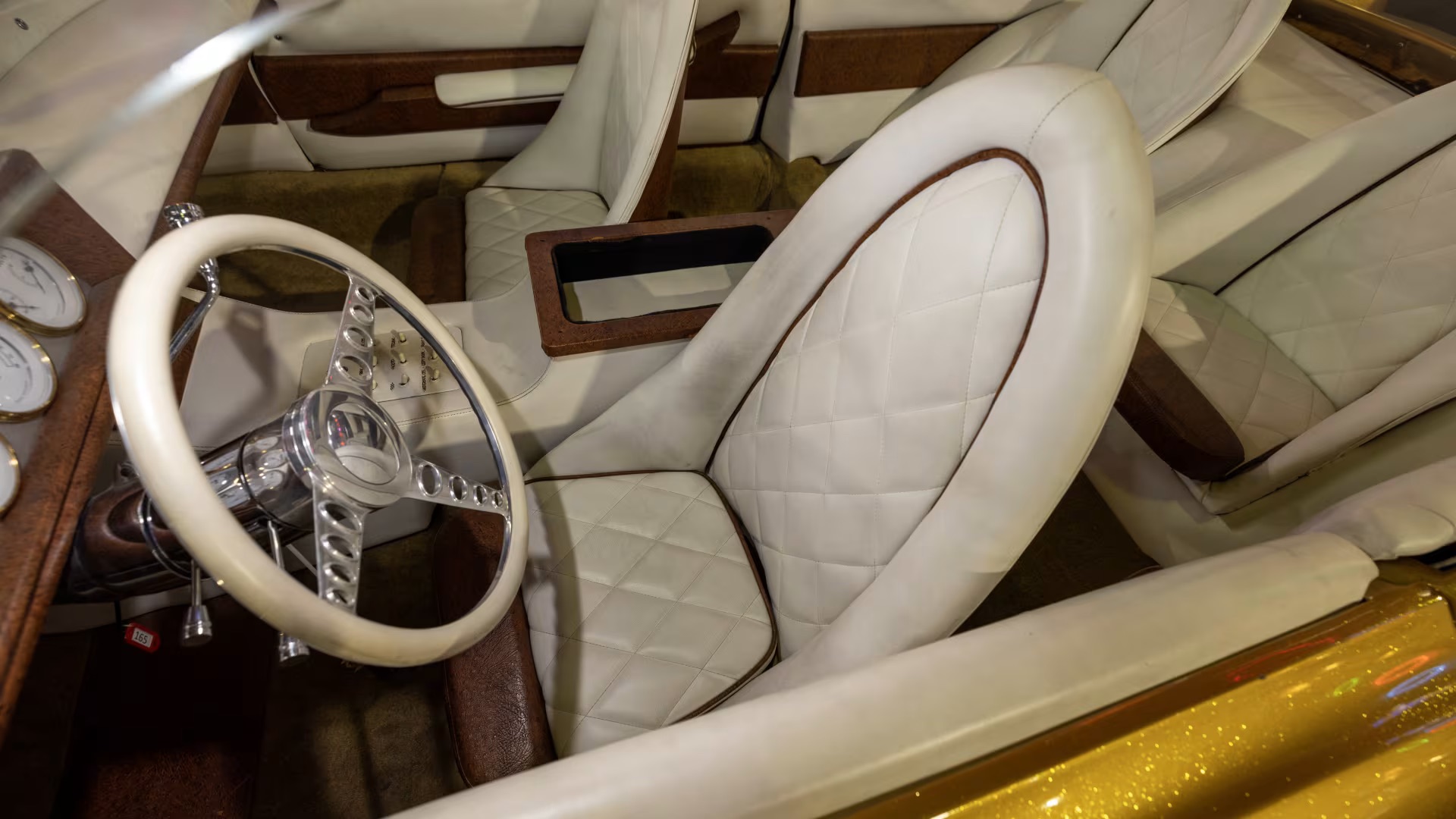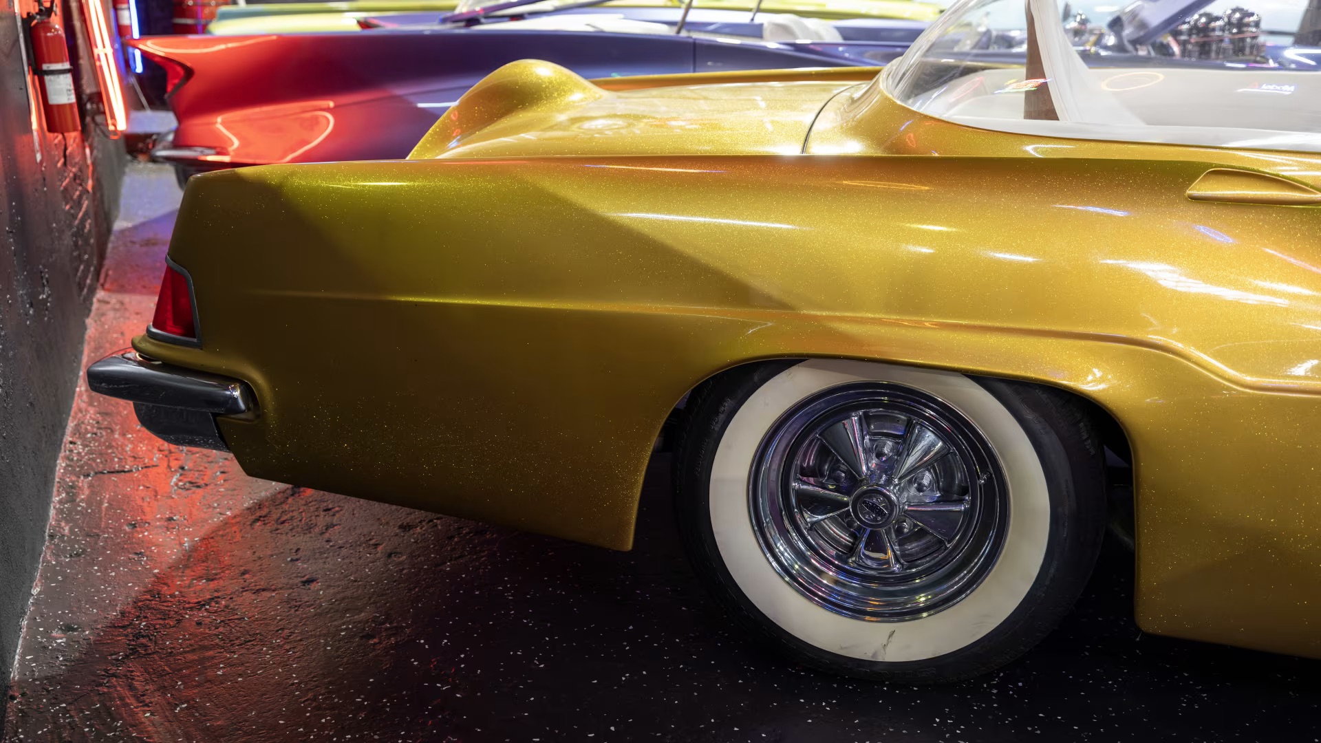 Fletcher’s creation is defined by a series of unconventional design choices. The most notable is the six-wheeled layout, with four wheels in the front for a distinct profile. Other striking details include tapered headlights, Imperial fins, and “nozzle reactors” on the back designed in the style of an early 1960s Cadillac. Powering this elaborate custom is a robust 500ci Cadillac engine, which was sourced from a later model. The interior is equally captivating, with a “Jet Age” theme and golden hues throughout.