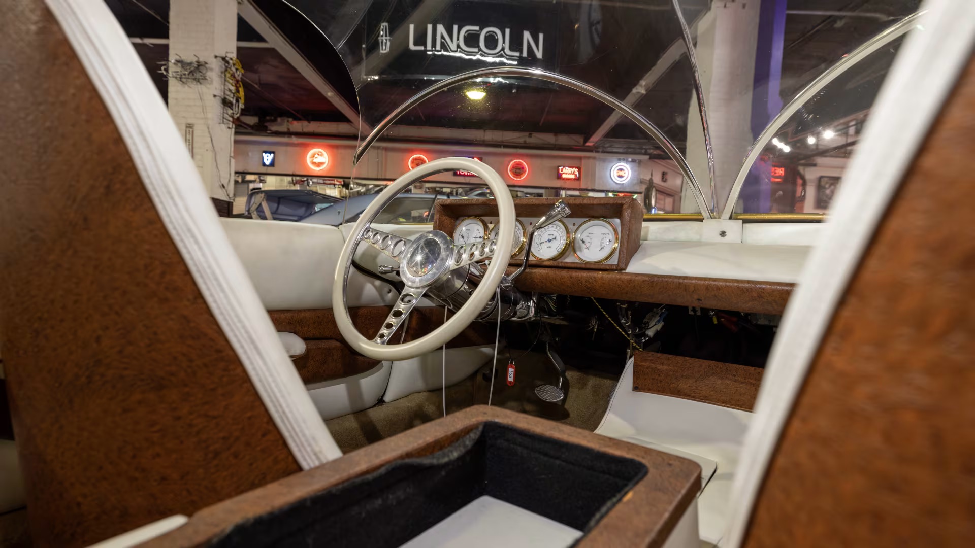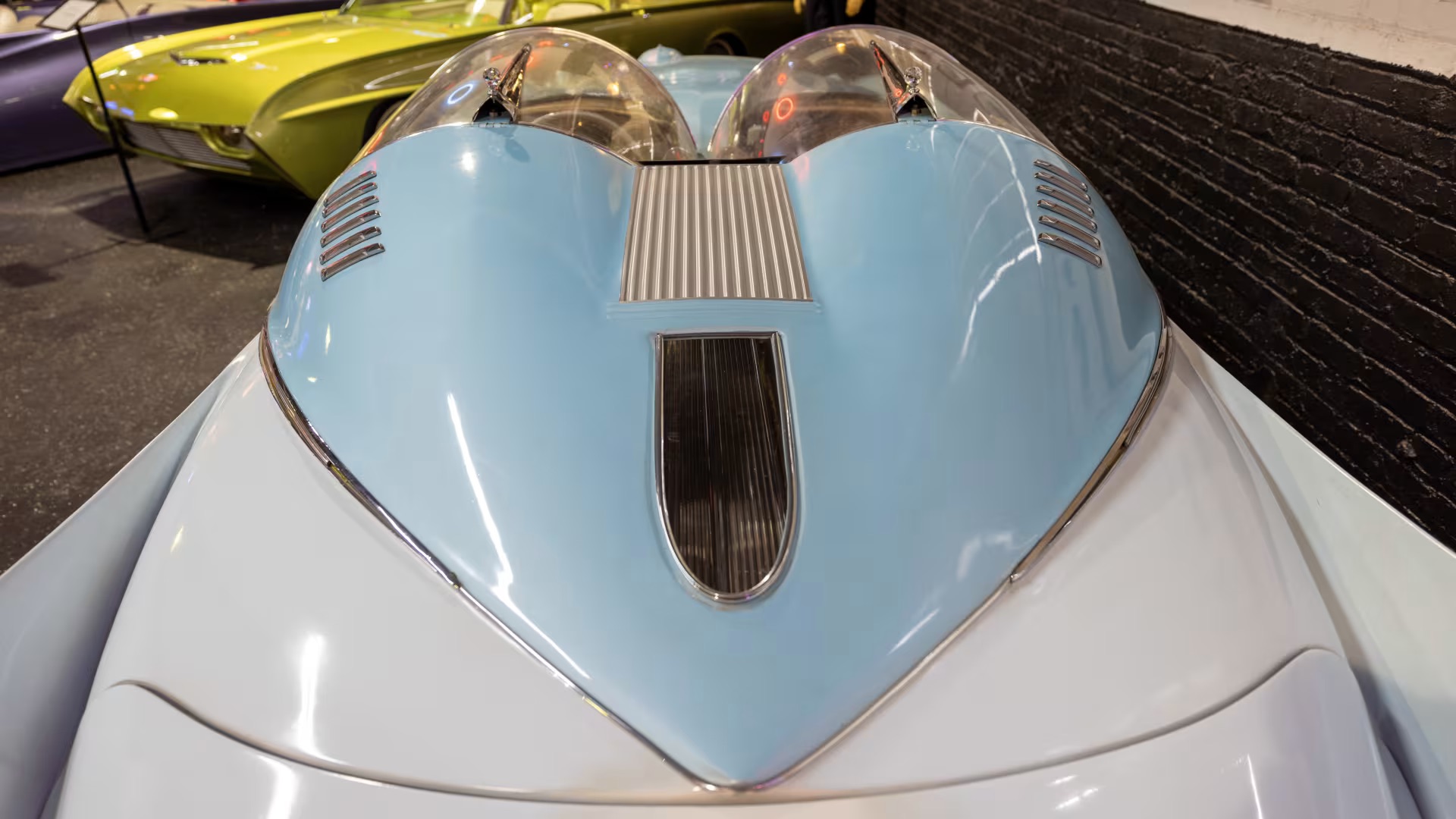 The Ice Princess XF58 began its life in the 1980s, where Fletcher used a 1950 Studebaker sedan as the base for his radical design. He hand-formed the bodywork by blending Studebaker sheet metal with that of a 1960 Cadillac, resulting in a 20-foot-long, spaceship-like ride. The car’s aesthetic is heavily influenced by the 1950s jet age, featuring a double bubble canopy reminiscent of the Lincoln Futura and a twin-cockpit design like that of an F4 Phantom jet.