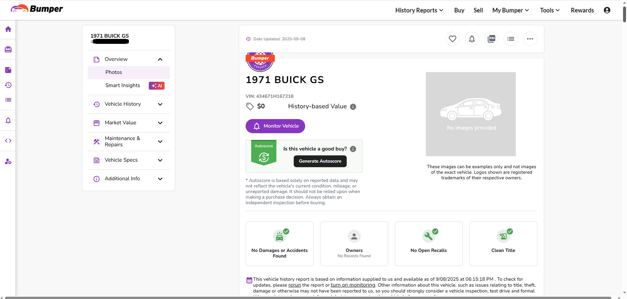 There may be tell-tale signs such as too low a price, or very recent out-of-state title issuance, but the best way to verify the history is to order a VHR from Bumper.com. With Bumper.com, you get a detailed history of the vehicle, including sales history, accidents*, theft, liens, recalls, estimated market value, and more. You don’t even need the VIN, you can use the plate to get the information as well.