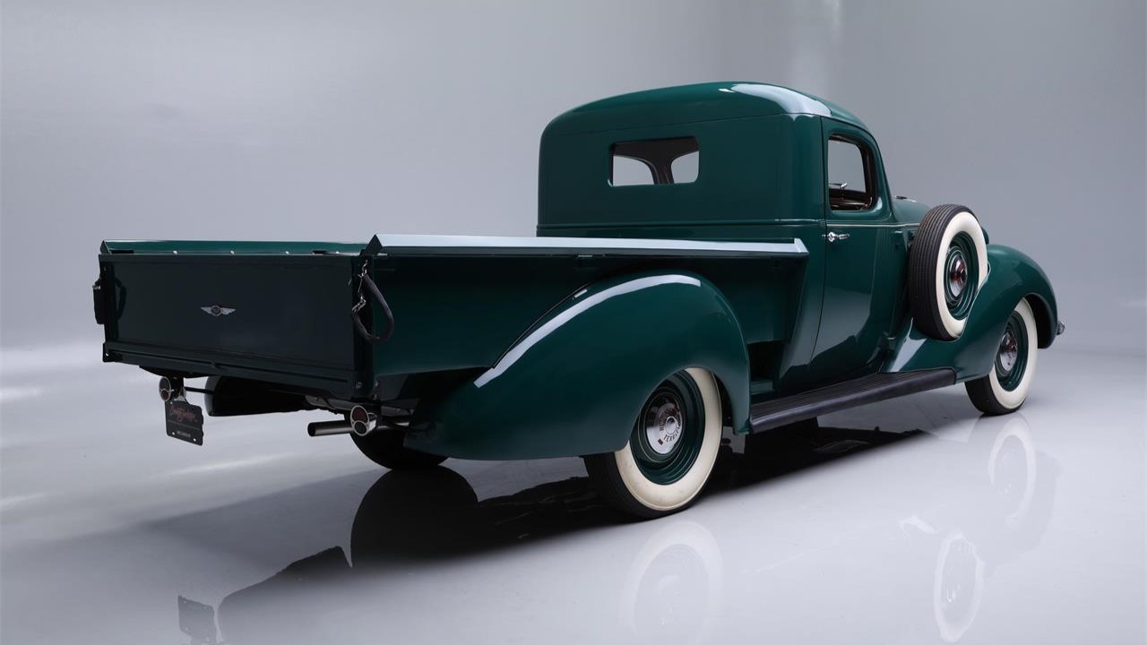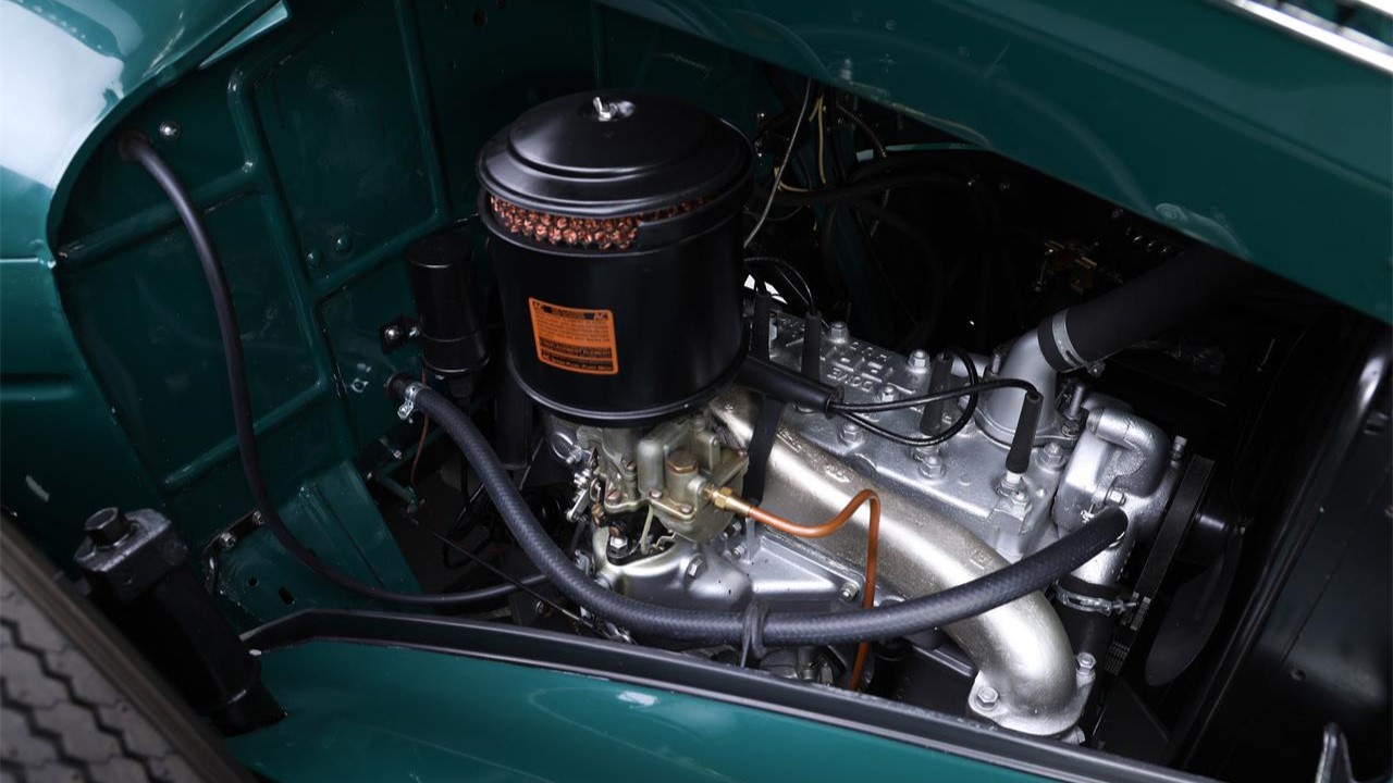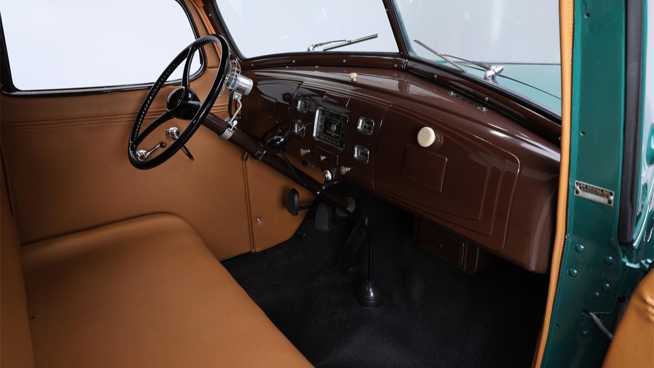 What a job well done. Not only is this truck a great design with sweeping curves, but its dark green exterior – with wide-whitewall tires – and tan interior colors make it even more attractive. The bed, which extends past the rear bodywork, helps make the most of this truck’s three-quarter-ton rating. Its tailgate flips down to reveal storage areas for things such as tools and the original screw jack.