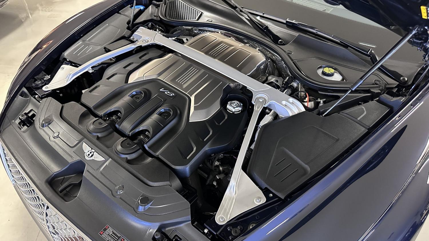 The Dark Sapphire Metallic paint is nicely complemented by lower-body chrome trim. Of course, the blue soft top is power-operated and includes a tonneau cover. Also note the jewel-like headlights with 55 individual LED lights each. Other features include a pair of twin exhaust pipes and dual power-adjustable side mirrors. A set of 22-inch Open Spoke Alloy wheels is wrapped in staggered-width Pirelli P Zero radials—275/35 front, 315/30 rear.
