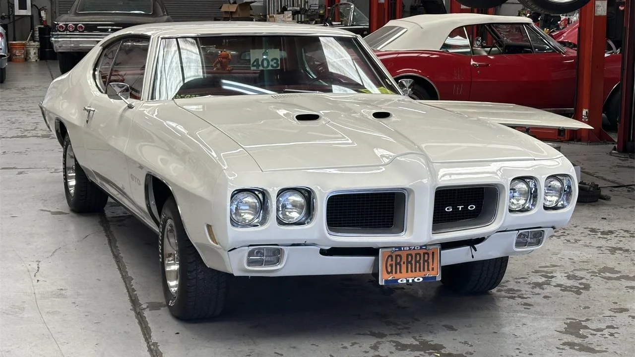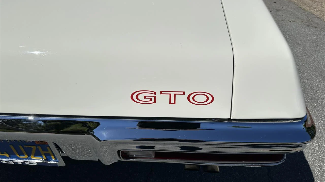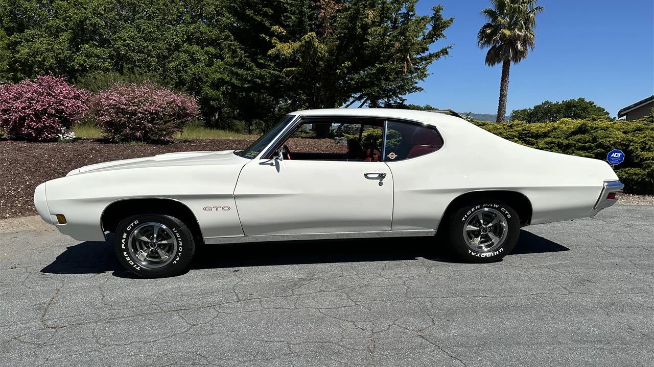 The seller describes this 1970 GTO as a “gorgeous restored” example painted in its factory color of Polar White with a basecoat/clearcoat process. The seller goes on to say that the second owner had it for 25 years and that they are the third owner.
