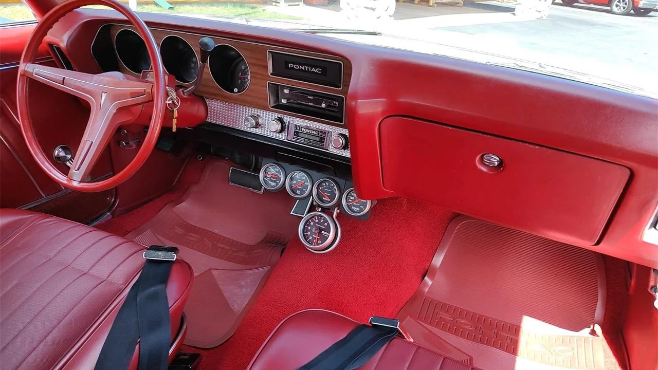 This GTO’s interior is also in extremely good condition, having been completely redone (apart from the original dash) by Legendary Auto Interiors during the restoration. This included the factory-correct red bucket seats, sail panels, deluxe package shelf, headliner, front and rear door panels, armrests and bases. The instrument cluster, which currently shows 72,000 documented miles, is original. The car does feature an upgraded Alpine AM/FM stereo with Bluetooth, happily hidden in the glovebox. A quad set of gauges and tach are mounted under the dash. The car has a deluxe steering wheel (with all three horn buttons working) and deluxe seat belts with shoulder belts front and rear, as well as new carpet, deluxe Pontiac floor mats, and new sill plates.