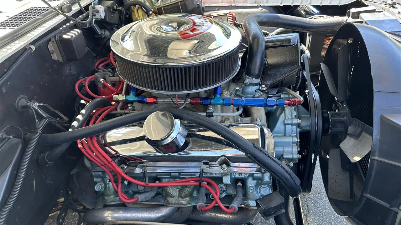 The 350ci Chevrolet V8 is equipped with an aftermarket camshaft, an Edelbrock intake manifold and carburetor, and four-into-one headers that flow into a dual exhaust system with a crossover pipe.