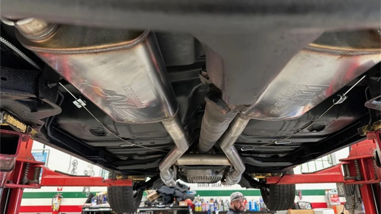 Power is sent to the rear wheels through a three-speed automatic transmission and a 10-bolt rear end. Corrosion is visible on underbody components, which can be viewed in the gallery.