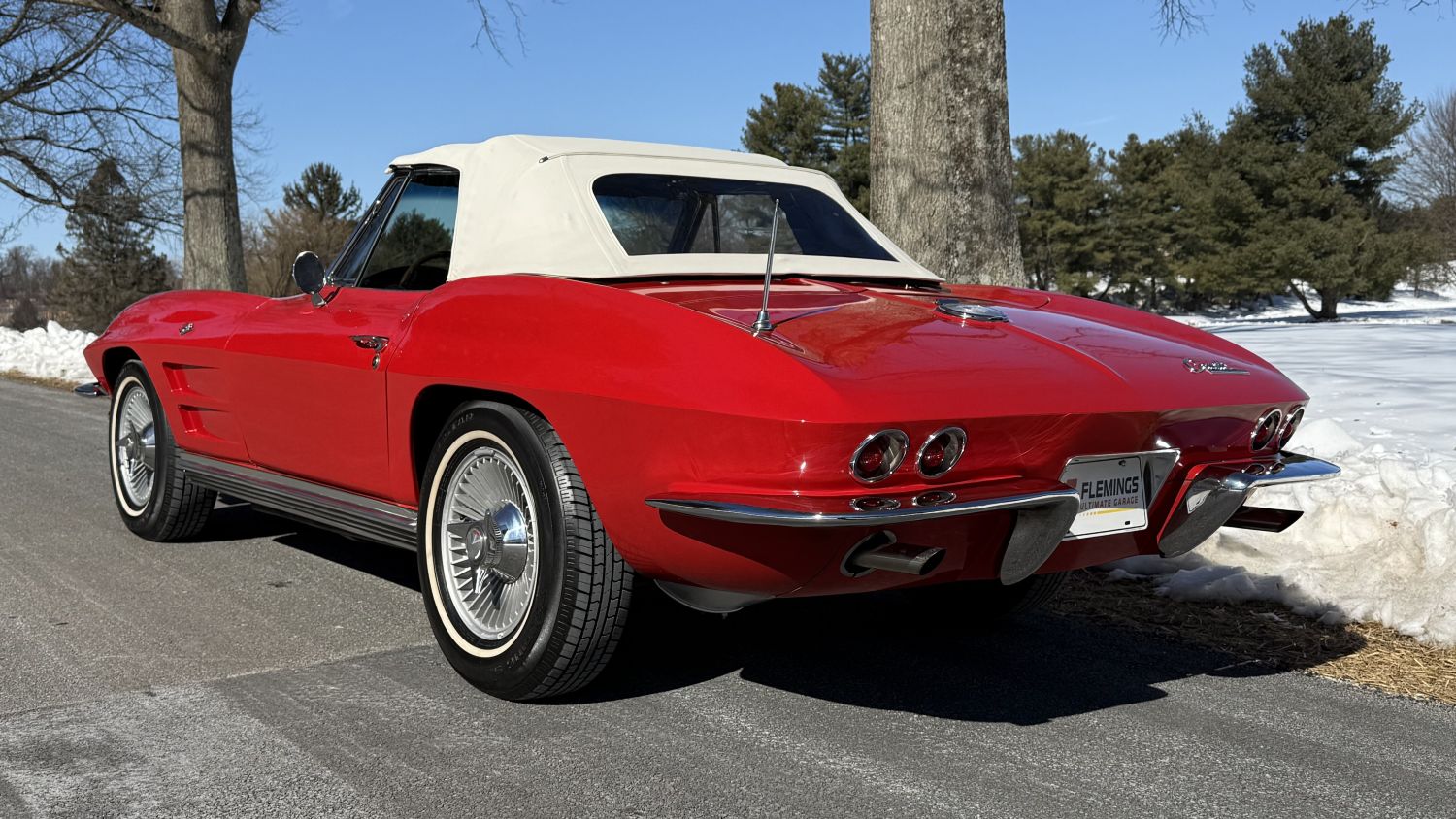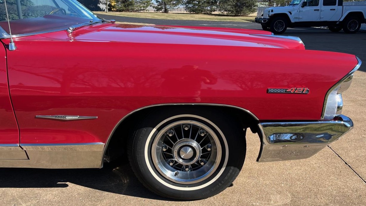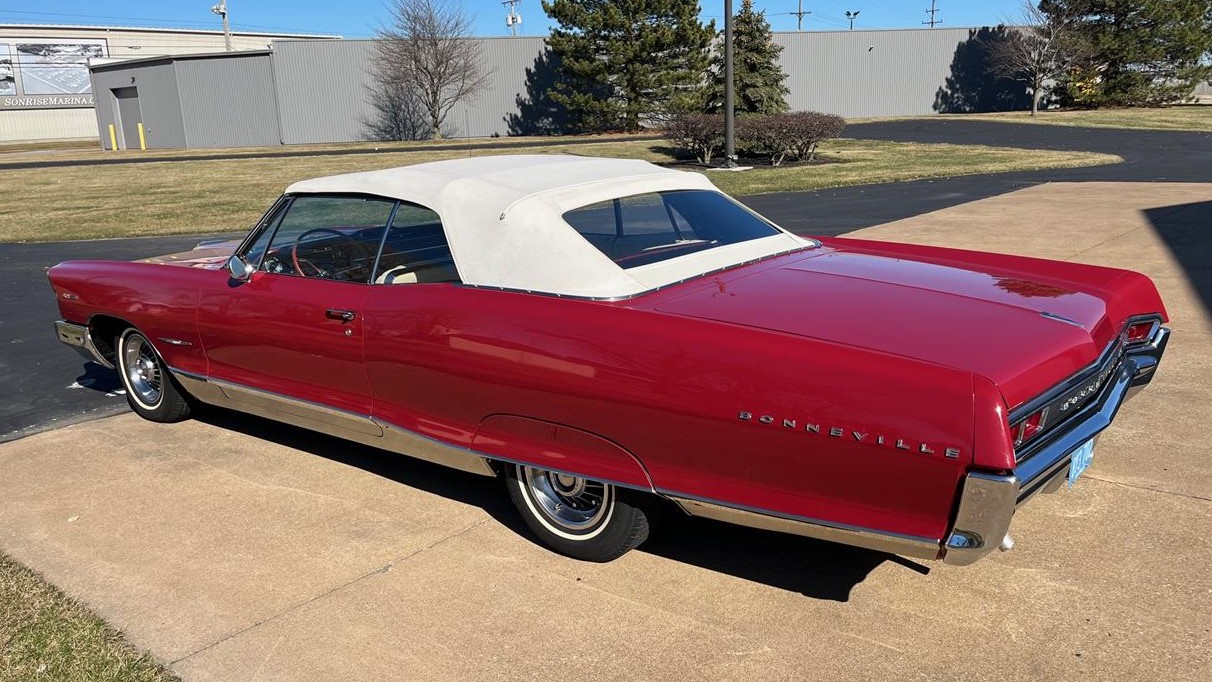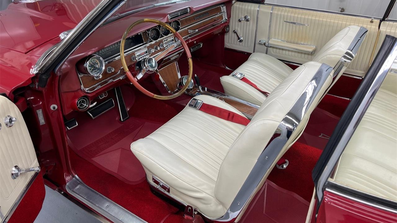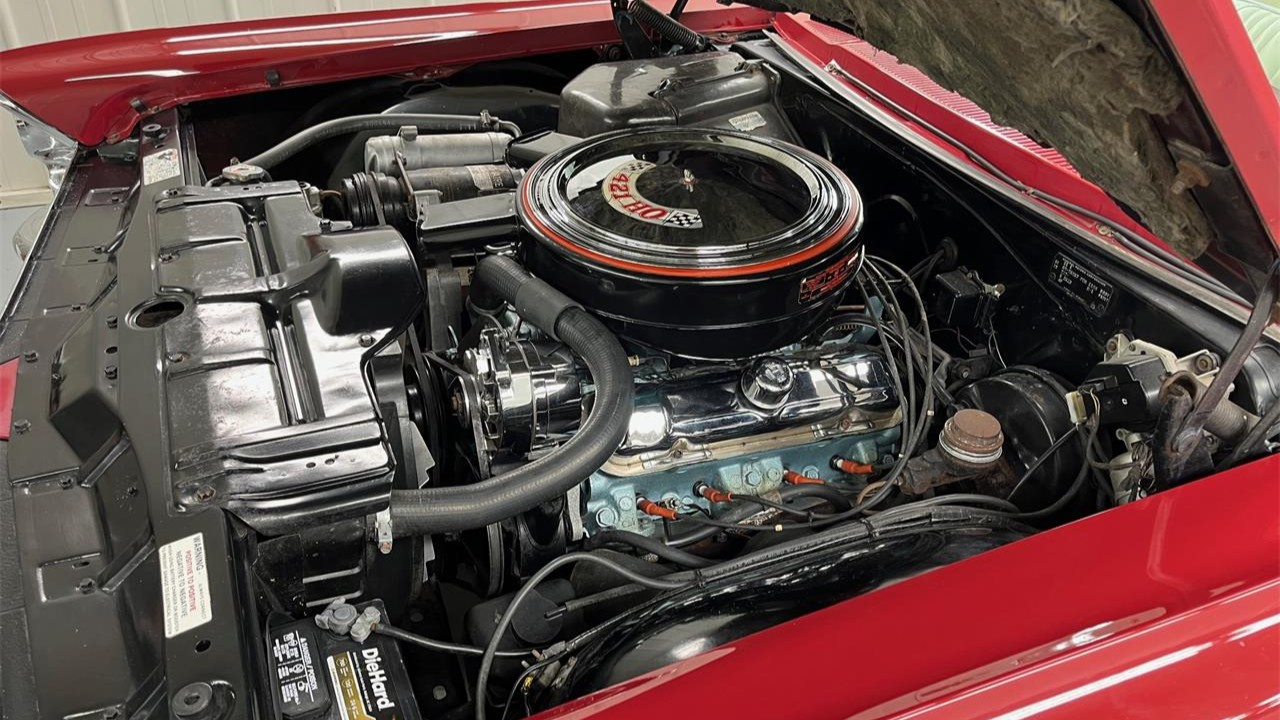 The exterior of this Corvette looks to be in fine condition, with the Riverside Red paint looking excellent. In addition, the car has a factory-correct convertible top, the chrome has been replated, and the car rides on 15-inch turbine-style knock-off wheels clad with 215/75 whitewall radial tires.