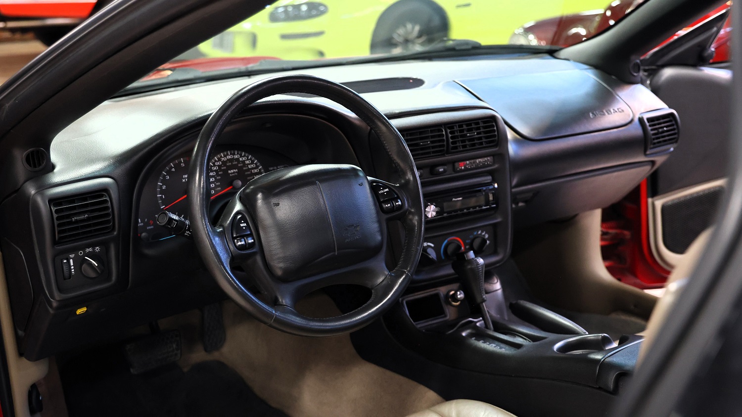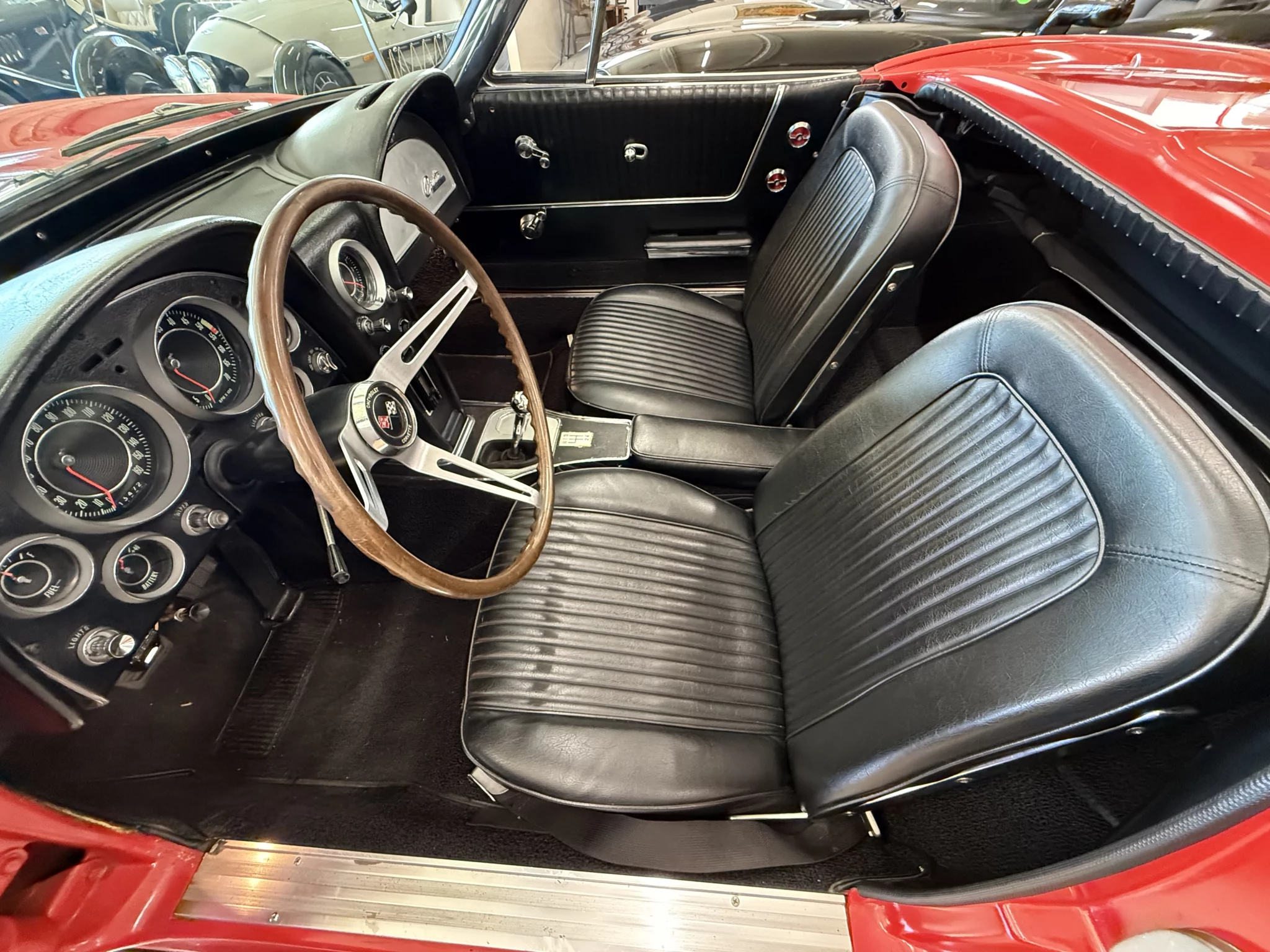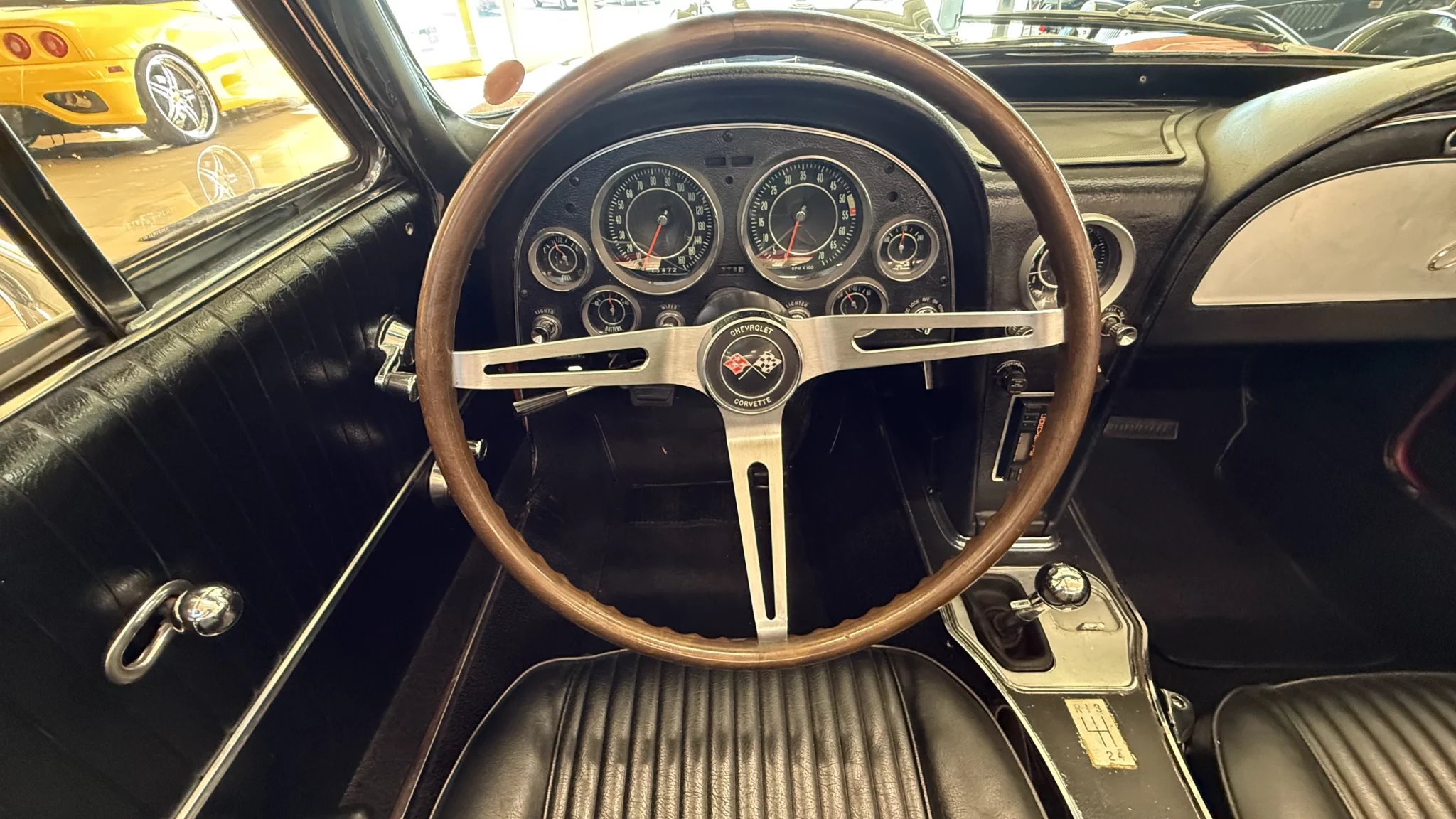 The interior of this car looks as nice as the exterior. the black vinyl upholstery is both completely correct and in excellent condition. The car features power steering, a beautiful factory-style three-spoke wood steering wheel, and an aftermarket retro-look AM/FM cassette stereo. Like all C2 Corvettes, this car features full instrumentation including a 160-mph speedometer, 7,000-rpm tachometer, and auxiliary gauges for oil pressure, temperature, battery, and fuel level. All gauges have been restored.