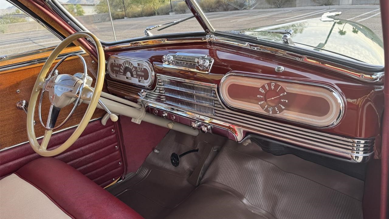 The two-row interior was reupholstered in maroon vinyl and tan cloth — an unexpected combo given the exterior colors. One thing that’s not shocking is the presence of even more wood, which forms the door panels and even the ceiling. The ivory-colored steering wheel, vintage gauges, and brightwork on the dash lighten up the cabin and make it even more attractive.