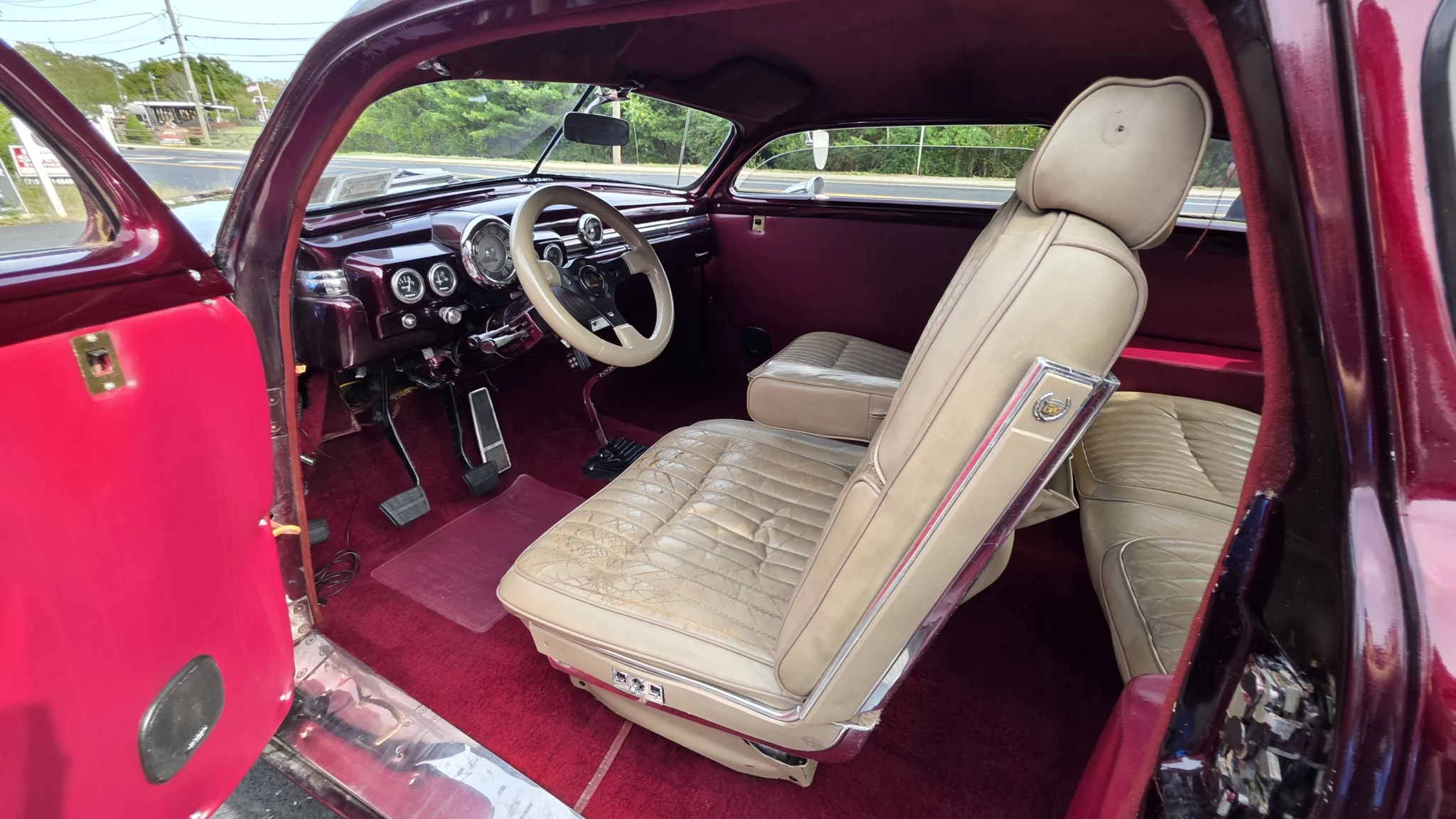 Finished in “Black Cherry,” the exterior features include chrome bumpers, a custom grille, Frenched headlights, a louvered hood, a chopped top, dual side mirrors, shaved door handles, rear wheel skirts, custom taillights, and a dual exhaust system. The body was smoothed, lowered, and polished to perfection – complete with an accent pinstripe that runs the length of the body.