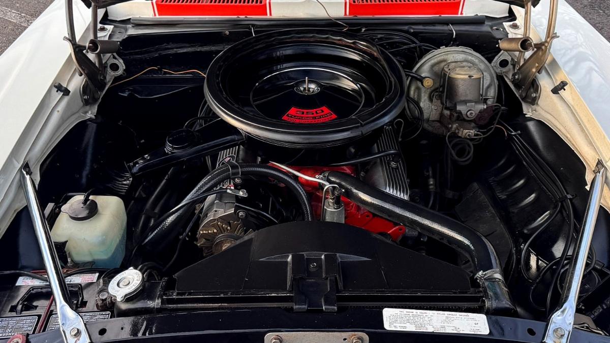 The 350ci V8 is topped by a chrome air cleaner and valve covers. Wrapped headers are linked to a dual exhaust system, and the battery is located in the trunk. Fluids were changed in 2025.