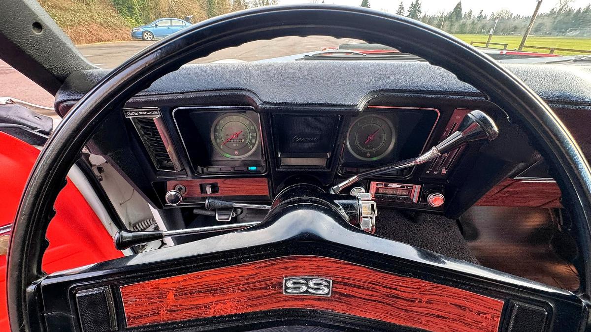 The engine under the Cowl Induction hood is the standard engine for the SS package, which was a 300-horsepower 350 with a four-barrel carburetor—note the air cleaner baffle that mates to the plenum on the underside of the hood. A TH350 three-speed automatic puts the powerplant through the gears.