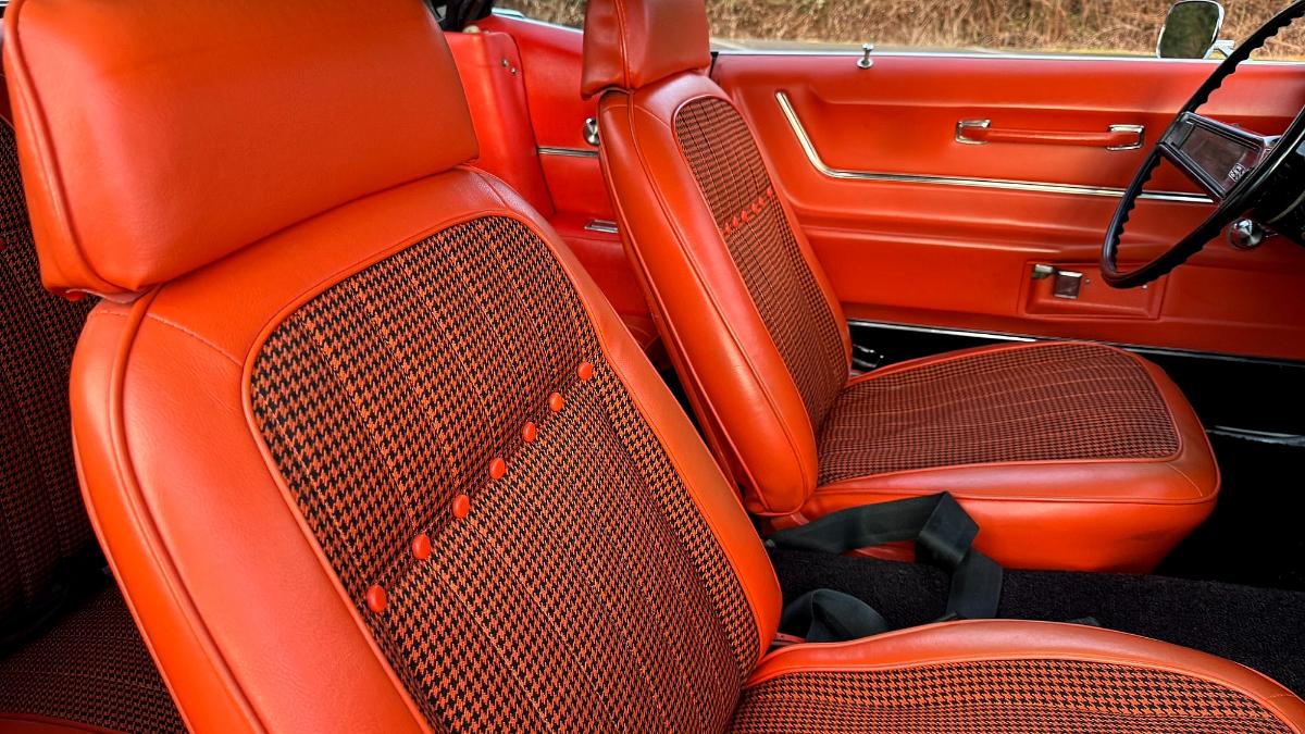 The cabin is furnished with orange vinyl upholstery with black and orange houndstooth cloth inserts for the seats. There is no console, which means the automatic shifter is on the column—unusual for these cars. Other interior features include woodgrain trim, power steering, tilt steering column, and aftermarket retro-look AM/FM/Bluetooth stereo.