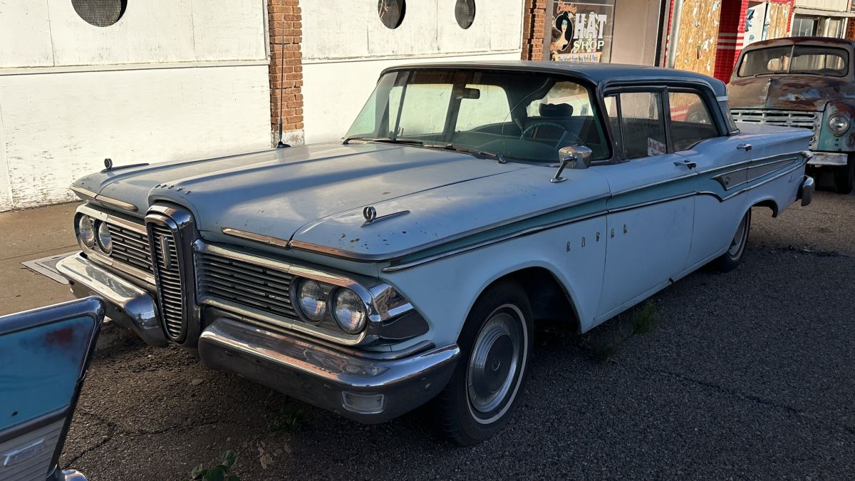 The Ranger’s shield-shaped grille was an unmistakable feature for the time. The Ranger was an entry-level model for Ford’s Edsel brand, and it could be ordered as a sedan or a hardtop. This baby-blue four-door had nice chrome and a very straight body – a strong candidate for restoration if someone decided to go that route.