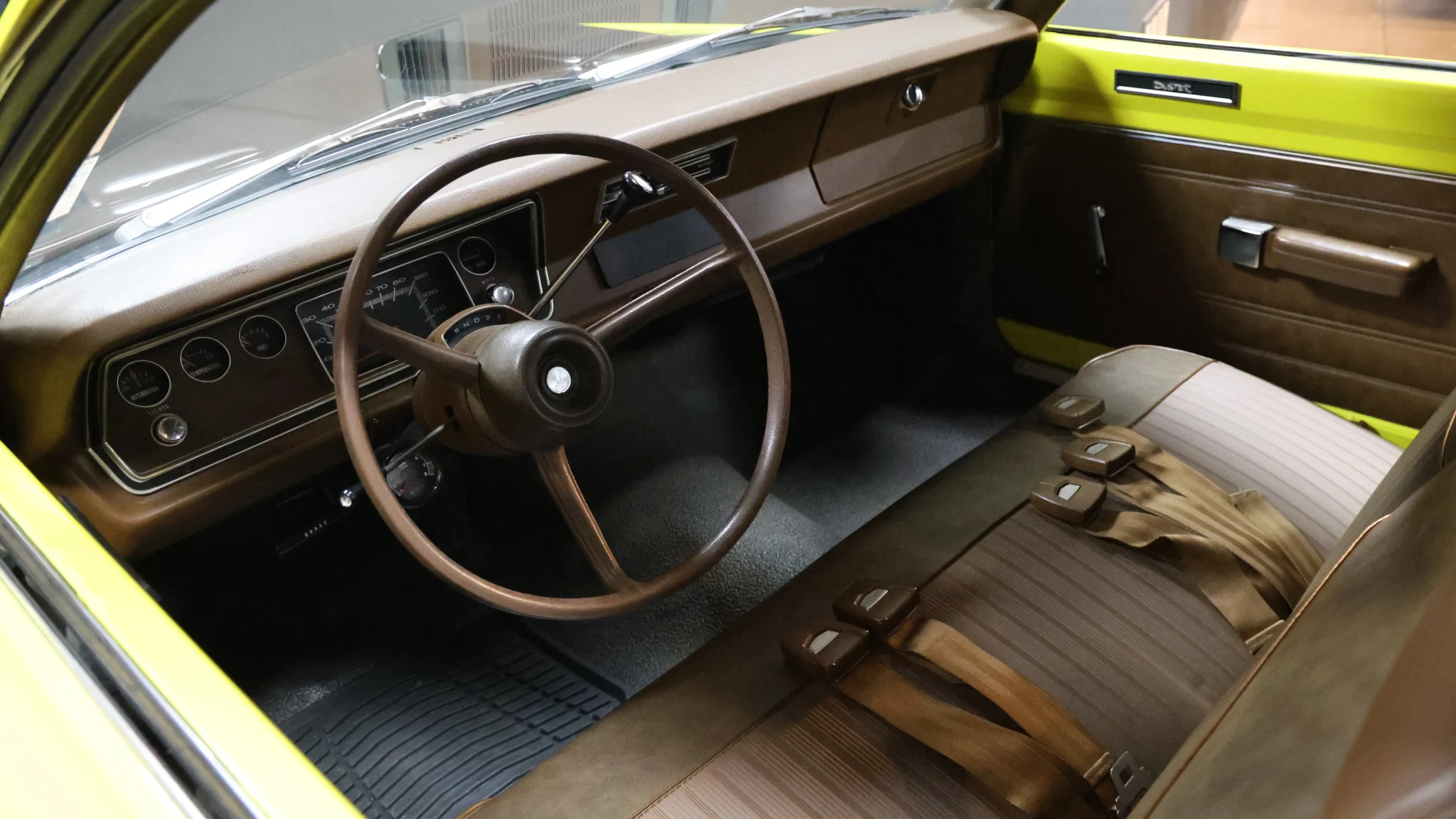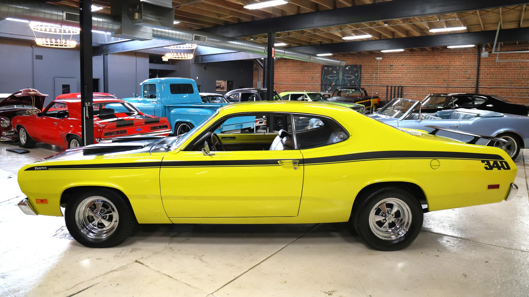 The seller describes this Duster as being powered by a Mopar Performance 360ci V8 mated to a three-speed 904 automatic transmission with 2700 stall converter. Finished in Curious Yellow over a Chestnut vinyl interior, this classic is offered by the selling dealer with a build sheet and clear title.