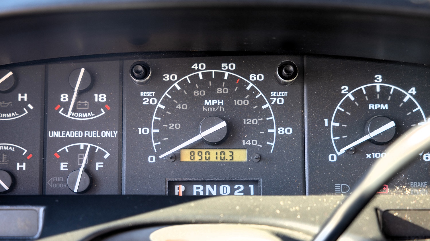 Behind the four-spoke steering wheel is an 85-mph speedometer, 6,000-rpm tachometer, and gauges for the oil pressure, voltage, temperature, and fuel level. The digital odometer shows 89,010 miles, although the AutoCheck report’s latest mileage reading from November 2025 was 8,455 miles. Either way, this truck is mileage-exempt according to its title.