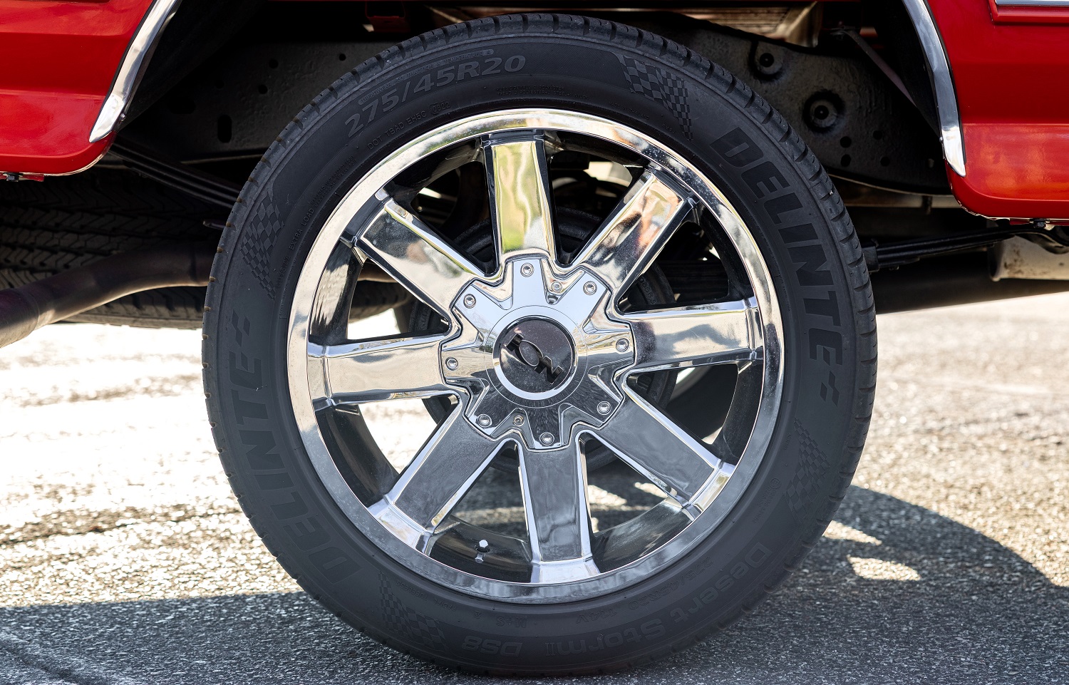 As you may have noticed already, there’s even more brightwork underneath this truck, where the factory wheels have been replaced with 20-inch chrome Ion 141s wrapped in 275/45 Delinte Desert Storm II tires.