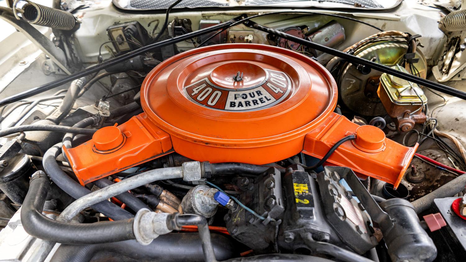 The 402ci Chevrolet V8 is equipped with an Edelbrock intake manifold and dual four-barrel carburetors as well as a PerTronix Flame Thrower distributor, a Mallory ignition coil, and finned valve covers. The engine is said have an aftermarket camshaft. Four-into-one headers with capped cutouts flow into 2.5” exhaust pipes with glasspacks and side outlets. Cooling is provided by a high-volume water pump and an aluminum radiator with dual electric pusher fans. The seller notes the exhaust system is loud.
