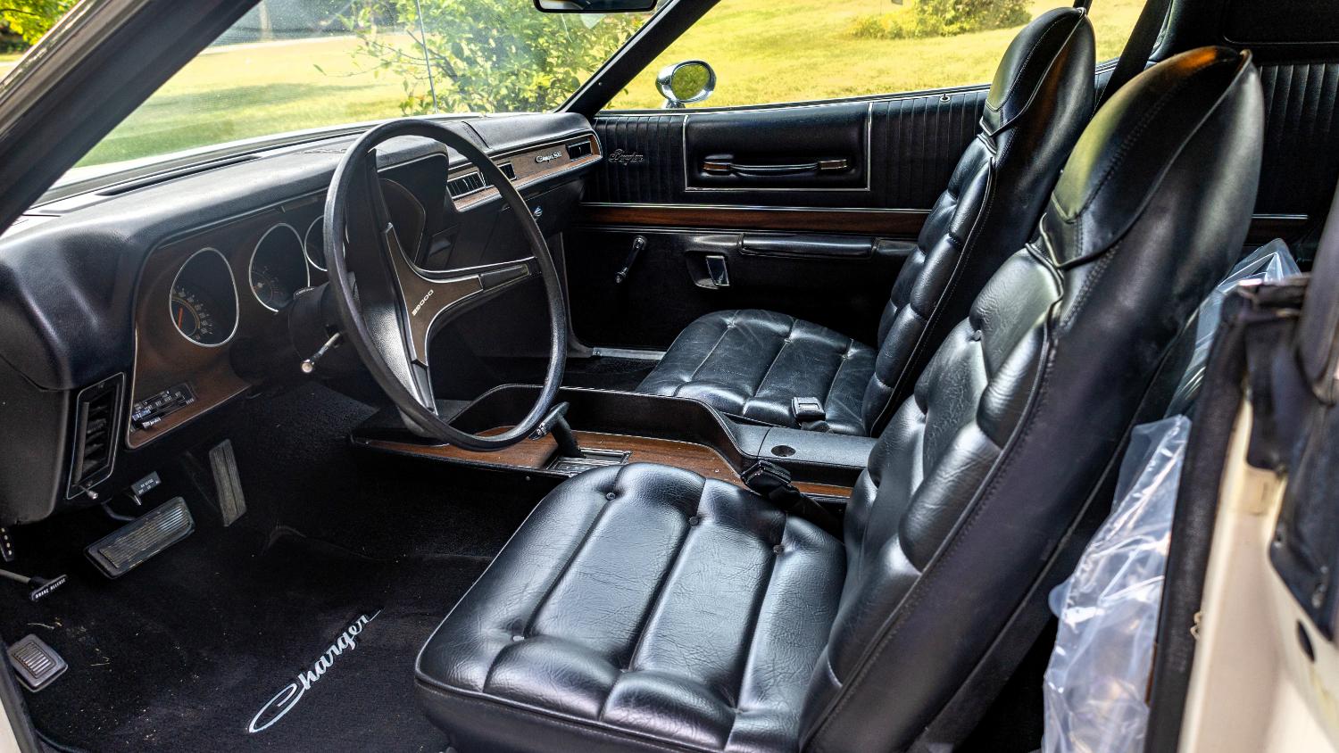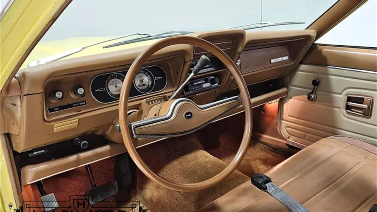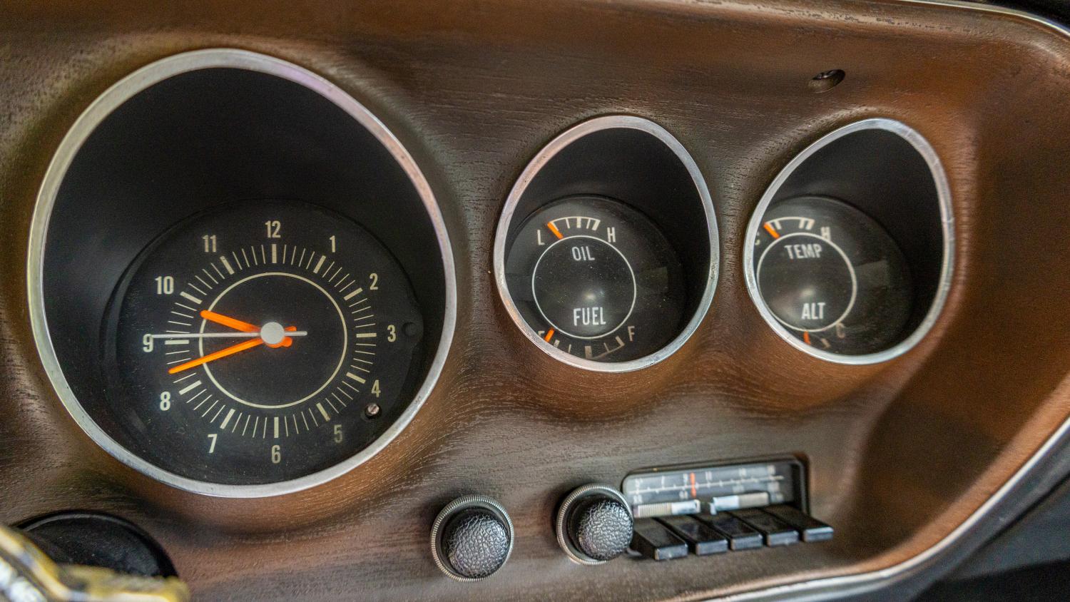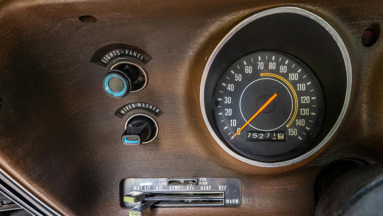 The steering wheel has a blue metal-flake rim and sits ahead of Marshall instrumentation consisting of a 160-mph speedometer, a 10k-rpm tachometer, and auxiliary gauges. The digital odometer has not been calibrated, and total mileage is unknown.