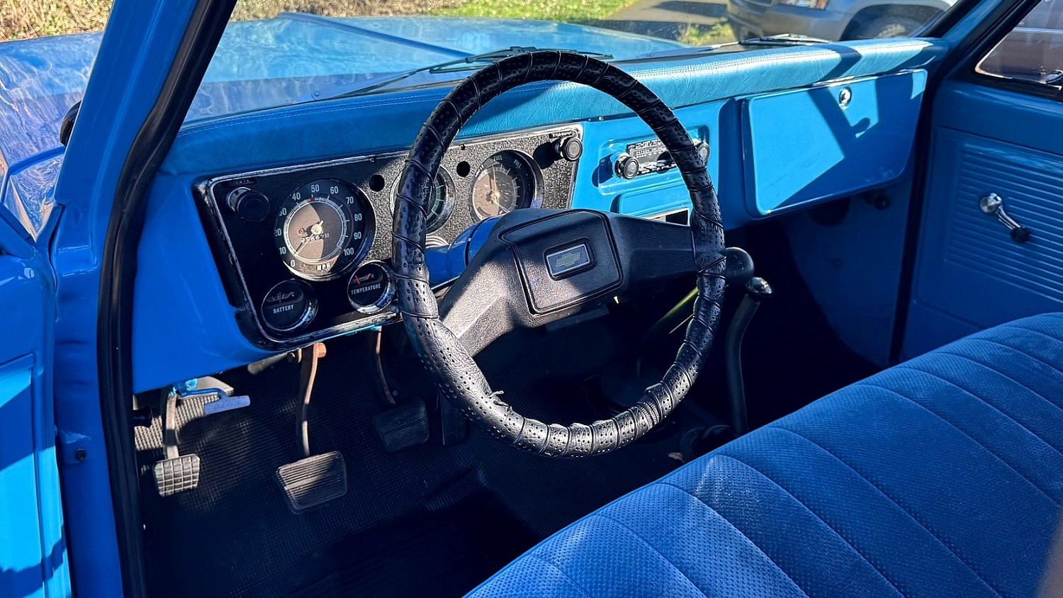 The cab houses bucket seats and door panels trimmed in black vinyl along with coordinated carpeting and trim. A Pioneer stereo unit is mounted in the glove box, an aftermarket air conditioning unit is installed under the dash, shoulder belts are fitted on each side, and a Lokar shifter is mounted in the transmission tunnel.
