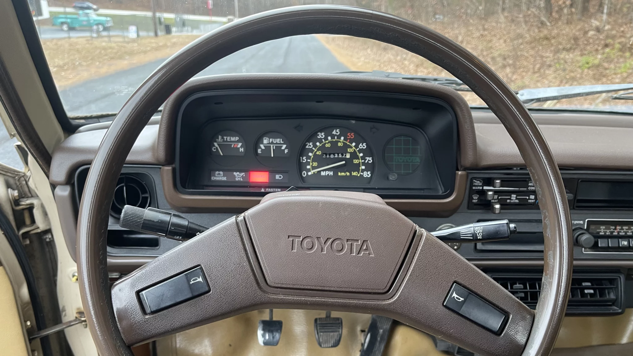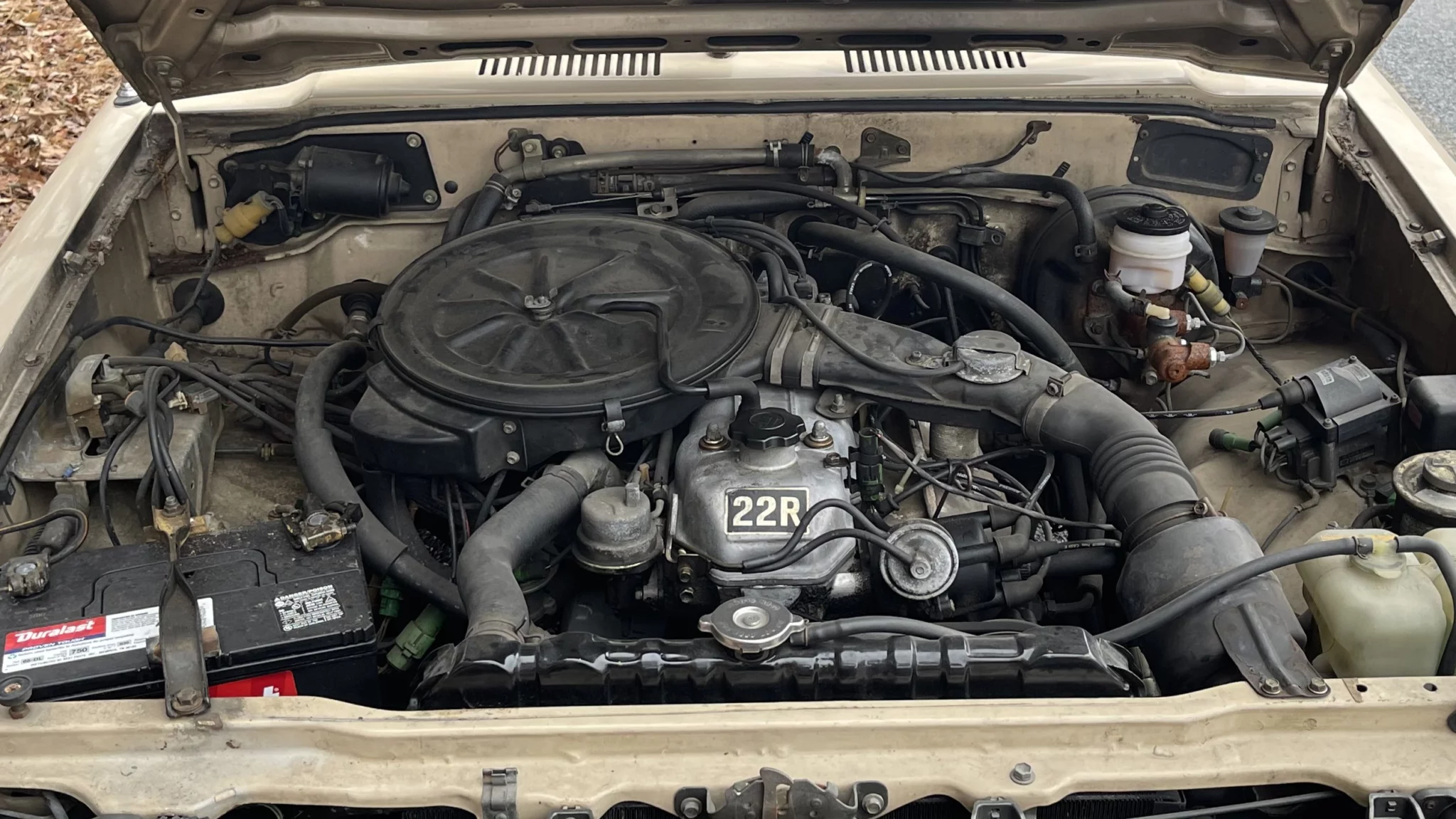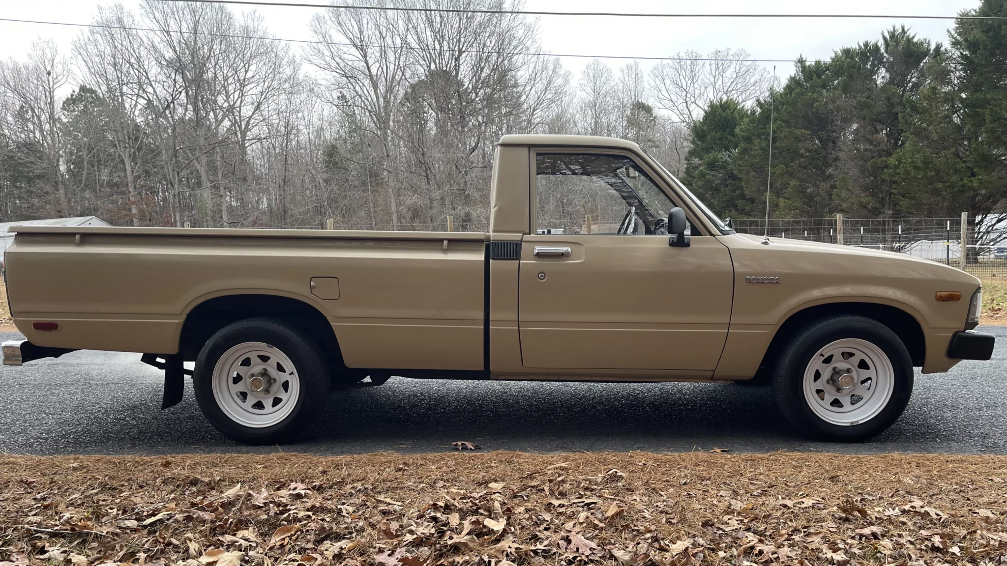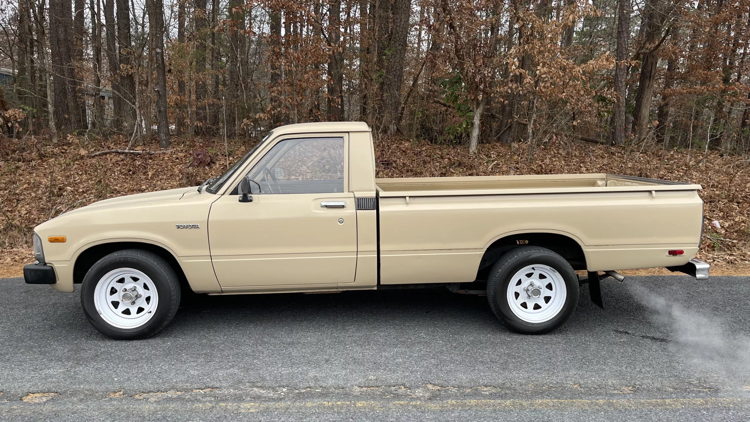 The truck rides on a Mitsubishi Mighty Max frame with independent front suspension and a solid rear axle with leaf springs and adjustable air shocks. The 14″ front and 15″ rear American Racing Torq Thrust wheels are wrapped in Prime Well radial tires measuring 195/75 at the front and 225/70 at the rear. Braking is handled by power-assisted front discs and rear drums.